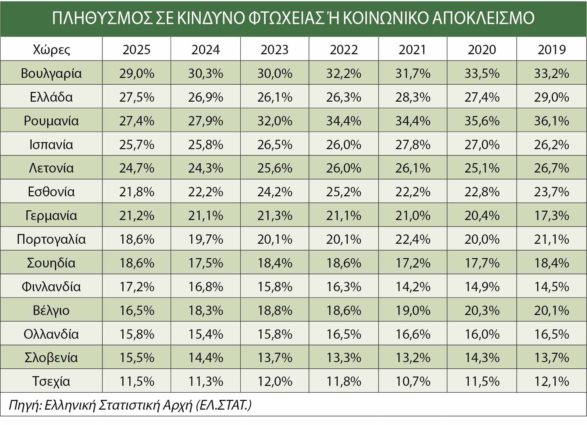 Αντίθετα, η Πορτογαλία έχει καταγράψει αισθητή μείωση, από 21,1% το 2019 σε 18,6% το 2025, γεγονός που την απομακρύνει από τις πιο ευάλωτες χώρες. Ακόμα χαμηλότερα βρίσκονται οι ισχυρές οικονομίες της κεντρικής και της βόρειας Ευρώπης. Η Γερμανία διατηρεί σταθερά ποσοστά γύρω στο 21%, ενώ χώρες όπως η Σουηδία, η Φινλανδία και η Ολλανδία κινούνται μεταξύ 15% και 19%, εμφανίζοντας μεγαλύτερη ανθεκτικότητα απέναντι στον κίνδυνο φτώχειας (βλέπε πίνακα).
