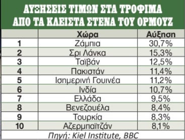 Την 7η χειρότερη αύξηση τιμών στα τρόφιμα παγκοσμίως θα έχει η Ελλάδα λόγω του πολέμου, μαζί με τη Ζάμπια, τη Σρι Λάνκα και το Πακιστάν! Πρόκειται για μια εφιαλτική πρόβλεψη για τη χώρα μας, η οποία «φιγουράρει» στη λίστα με τις 10 χώρες του πλανήτη που θα καταγράψουν τις μεγαλύτερες ανατιμήσεις στα τρόφιμα.