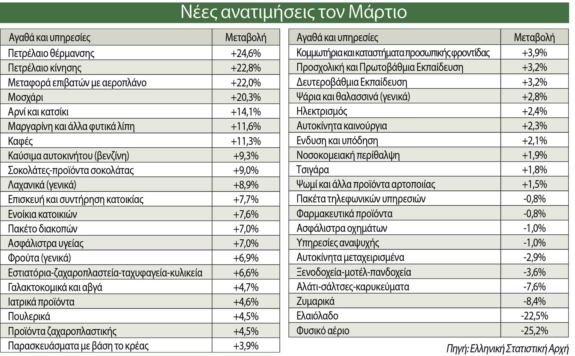 Σύμφωνα με τα στοιχεία της ΕΛ.ΣΤΑΤ., τον Μάρτιο καταγράφηκαν νέες εφιαλτικές ανατιμήσεις: