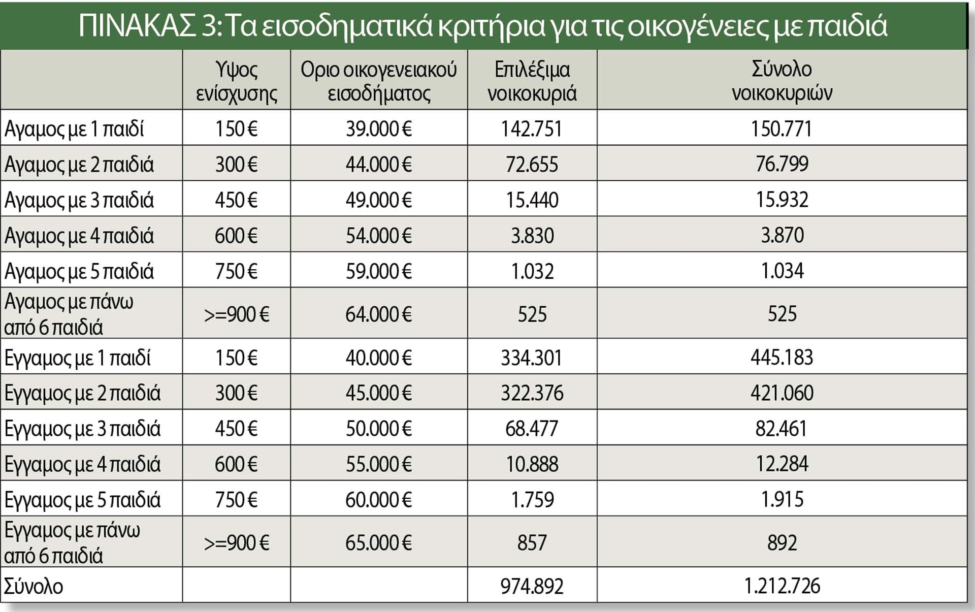 Για τα έγγαμα νοικοκυριά, το όριο ξεκινά από 40.000 ευρώ για ένα παιδί (ενίσχυση 150 ευρώ) και αυξάνεται στα 45.000 ευρώ για δύο παιδιά με την ενίσχυση να διαμορφώνεται στα 300 ευρώ. Συνολικά, δικαιούχοι εκτιμάται ότι είναι 975.000 νοικοκυριά από σύνολο 1,2 εκατ., που αριθμούν σχεδόν 3,3 εκατ. μέλη. Το δημοσιονομικό κόστος ανέρχεται σε 240 εκατ. ευρώ.