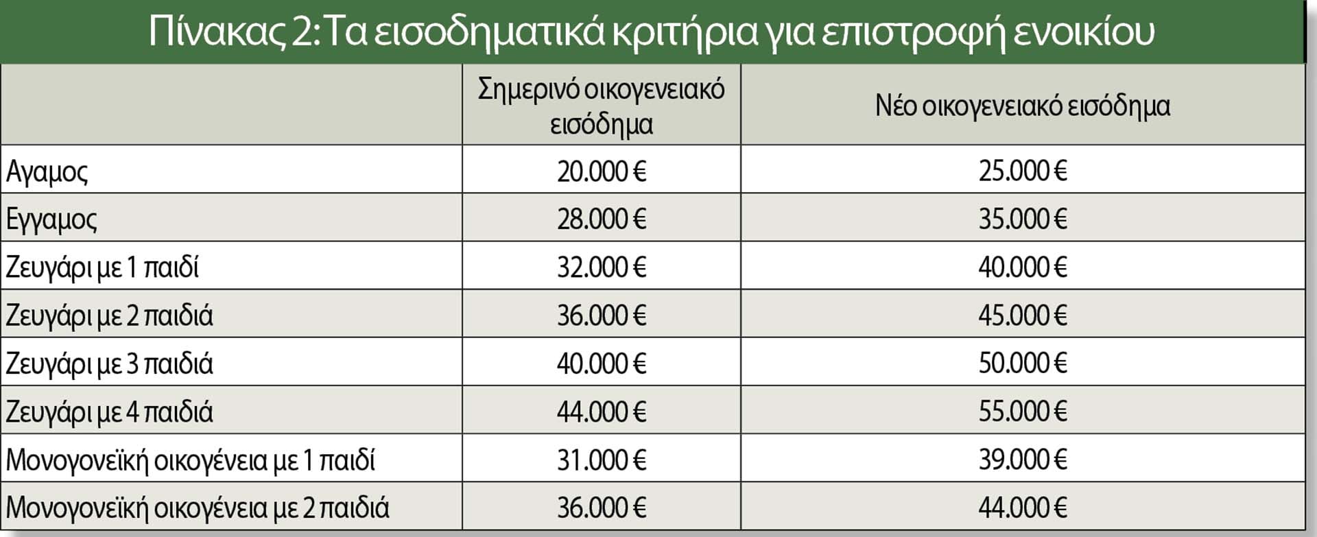 Για τους έγγαμους το εισοδηματικό όριο ανεβαίνει από τα 28.000 ευρώ (συν 4.000 ευρώ ανά παιδί) στα 35.000 ευρώ με προσαύξηση 5.000 ευρώ ανά παιδί. Για μονογονεϊκές οικογένειες, από τα 31.000 το όριο αυξάνεται έως και τα 39.000 ευρώ, με προσαύξηση 5.000 ευρώ για κάθε παιδί μετά το πρώτο. Με τις αλλαγές αυτές οι δικαιούχοι αυξάνονται σε περίπου 1,02 εκατ. από σύνολο 1,19 εκατ. ενοικιαστών, δηλαδή στο 86% των νοικοκυριών. Παράλληλα, προβλέπεται ειδική ρύθμιση για περίπου 50.000 γιατρούς και νοσηλευτές, οι οποίοι θα λάβουν δύο ενοίκια χωρίς εισοδηματικά κριτήρια τον ερχόμενο Νοέμβριο. Το επιπλέον δημοσιονομικό κόστος ανέρχεται σε 25 εκατ. ευρώ.