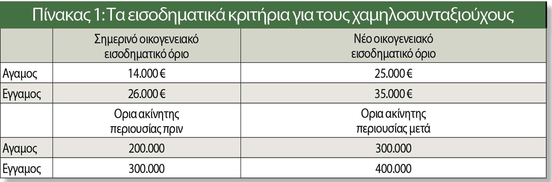 Τα όρια ακίνητης περιουσίας αυξάνονται από 200.000 ευρώ σήμερα σε 300.000 ευρώ για τους άγαμους και από 300.000 ευρώ σε 400.000 ευρώ για τους έγγαμους συνταξιούχους. Πρόκειται για τα ίδια όρια που χρησιμοποιούνται και στην επιδότηση του fuel pass, αλλά και στο πρόγραμμα «Σπίτι μου ΙΙ». Με τα νέα δεδομένα οι δικαιούχοι αυξάνονται κατά 420.000 και φτάνουν συνολικά τα 1,87 εκατ.