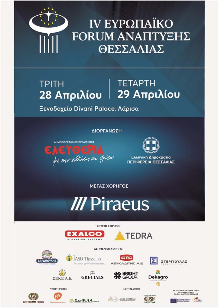 Σε μια κρίσιμη εποχή κατά την οποία η Ευρώπη επαναπροσδιορίζει τις στρατηγικές της προτεραιότητες και οι περιφέρειες καλούνται να διαμορφώσουν τη δική τους βιώσιμη και ανταγωνιστική αναπτυξιακή πορεία, το 4ο Ευρωπαϊκό Forum Ανάπτυξης Θεσσαλίας επιστρέφει στη Λάρισα στις 28 και 29 Απριλίου 2026, καθιστώντας τη Θεσσαλία τόπο σύνθεσης ιδεών και παραγωγής πολιτικής σκέψης.