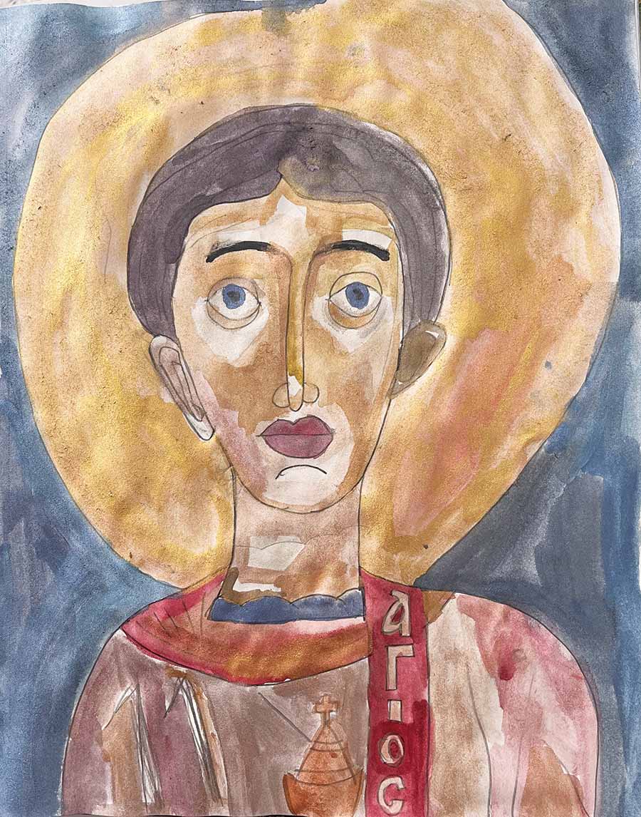 «Τον εντυπωσίαζαν πάντα τα χρώματα αλλά και οι μορφές των Αγίων, αφού ήδη έχει φιλοτεχνήσει κάποιους από αυτούς» επισημαίνει η κυρία Τσεκούρα και προσθέτει: «Η επίδραση της βυζαντινής αγιογραφίας είναι ορατή στο σχήμα των μυγδαλωτών ματιών που φτιάχνει. Επίσης, του άρεσε τόσο πολύ η βυζαντινή γραφή, ώστε συχνά στο σχολείο χρησιμοποιούσε αυτή τη γραφή με αποτέλεσμα να τον διορθώνουμε. Στη σκέψη του περίοπτη θέση έχουν και τα εξωκλήσια, όπως είναι π.χ αυτό που έχει ζωγραφίσει και βρίσκεται στην Αμοργό. Θα ήθελα πολύ να ασχοληθεί ακόμη περισσότερο στο μέλλον με τη βυζαντινή αγιογραφία. Λατρεία μεγάλη έχει και για τον Παρθενώνα. Τον έχει χαρακτηρίσει το μουσείο όλης της Ελλάδας».
