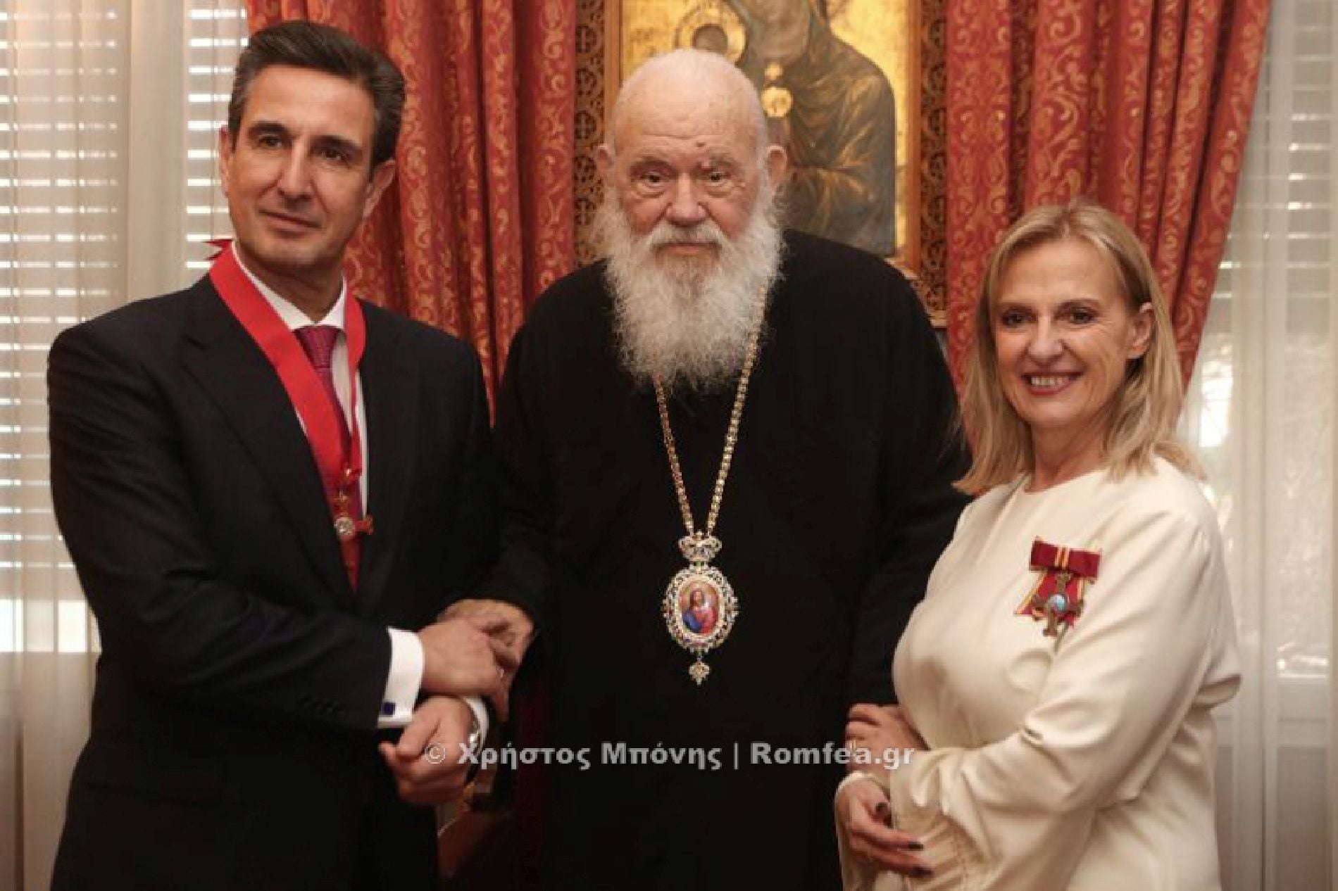 Σε σεμνή τελετή που πραγματοποιήθηκε το μεσημέρι στην Ιερά Αρχιεπισκοπή Αθηνών, ο Μακαριώτατος απένειμε στην κα Μπουζάλη το Μετάλλιο της Αγίας Οσιομάρτυρος Φιλοθέης της Αθηναίας και στον κ. Τρυφωνόπουλο το Μετάλλιο του Αγίου Διονυσίου του Αρεοπαγίτου.