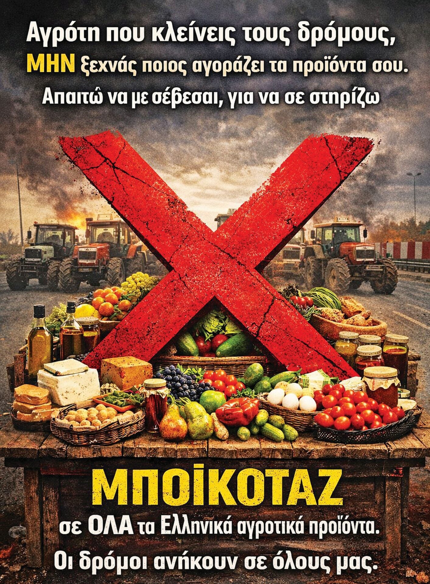 Καλούν σε μποϊκοτάζ όλων των ελληνικών αγροτικών προϊόντων επειδή οι αγρότες κλείνουν τους δρόμους που ανήκουν σε όλους!