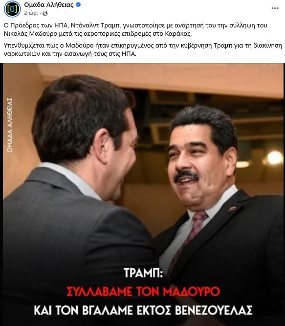 Δεν χρειάστηκε πολύ. Με το που ανακοινώθηκε από τον Ντόναλντ Τραμπ η σύλληψη του Νικολάς Μαδούρο μετά τις αεροπορικές επιδρομές στο Καράκας, η Ομάδα Αλήθειας έσπευσε να πανηγυρίσει την αμερικανική εισβολή στη Βενεζουέλα.