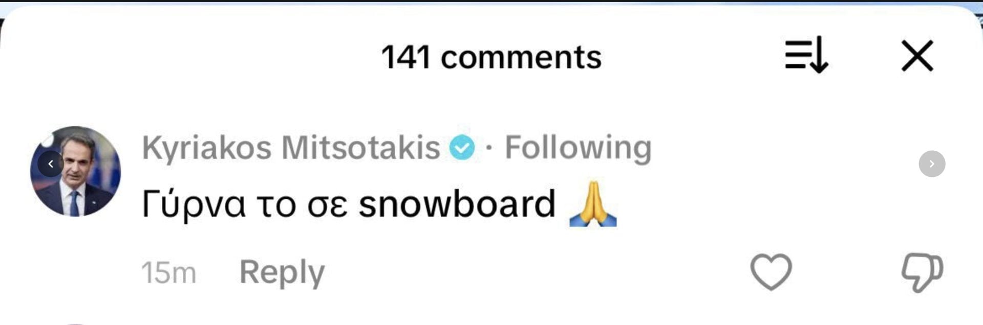 Συγκεκριμένα όταν ένας σκιέρ ανέβασε στο προφίλ του στο TikTok δύο φωτογραφίες του από το χιονοδρομικό κέντρο και ένα screenshot από μήνυμα του πατέρα του που τον παρακαλούσε να προσέχει λόγω της παρουσίας Μητσοτάκη στα Καλάβρυτα, δεν περίμενε ότι θα δει απάντηση από τον ίδιο τον Πρωθυπουργό.