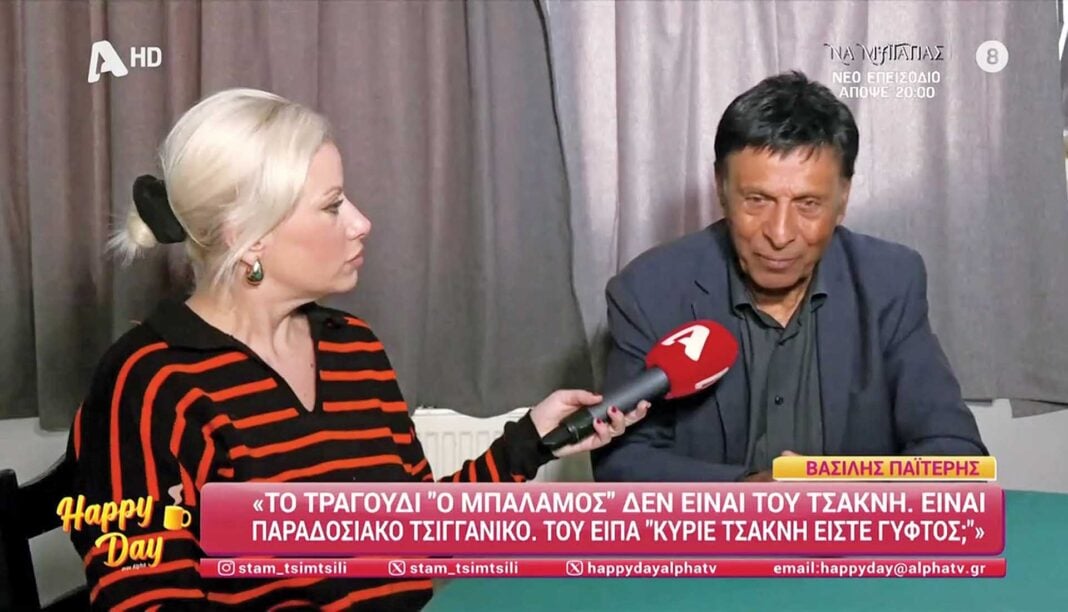 O Βασίλης Παϊτέρης έδωσε συνέντευξη στην εκπομπή «Happy Day». Μεταξύ πολλών άλλων έκανε αναφορά στο «Τραγούδι των γύφτων» του Διονύση Τσακνή και είπε τα ακόλουθα: «Εγραψα πολλά καλά τραγούδια, αλλά μου τα πήρανε, ‘βάλαν τ’ όνομά τους.