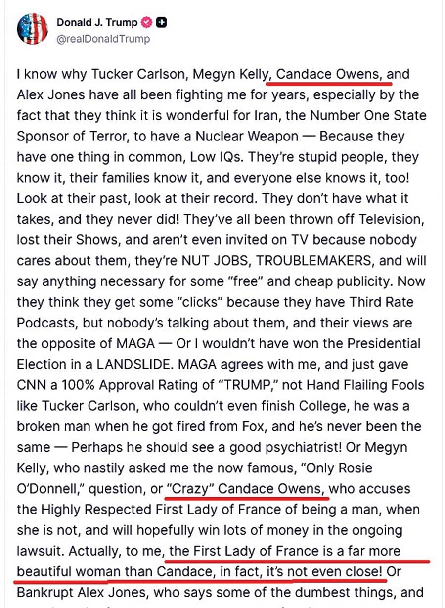 Εκανε μια μεγάλη ανάρτηση (βλ. εικόνα) στο Truth Social, το δικό του μέσο κοινωνικής δικτύωσης. Σε αυτήν χαρακτήριζε ανόητους, χασούρηδες και αποτυχημένους την Κάντις Οουενς, τον Τάκερ Κάρλσον, τον Αλεξ Τζόουνς και τη Μέγκαν Κέλι. Ο λόγος είναι η δριμεία κριτική που του ασκούν για τον πόλεμο με το Ιράν και τον ασφυκτικό έλεγχο που ασκεί το Ισραήλ στην πολιτική των ΗΠΑ.