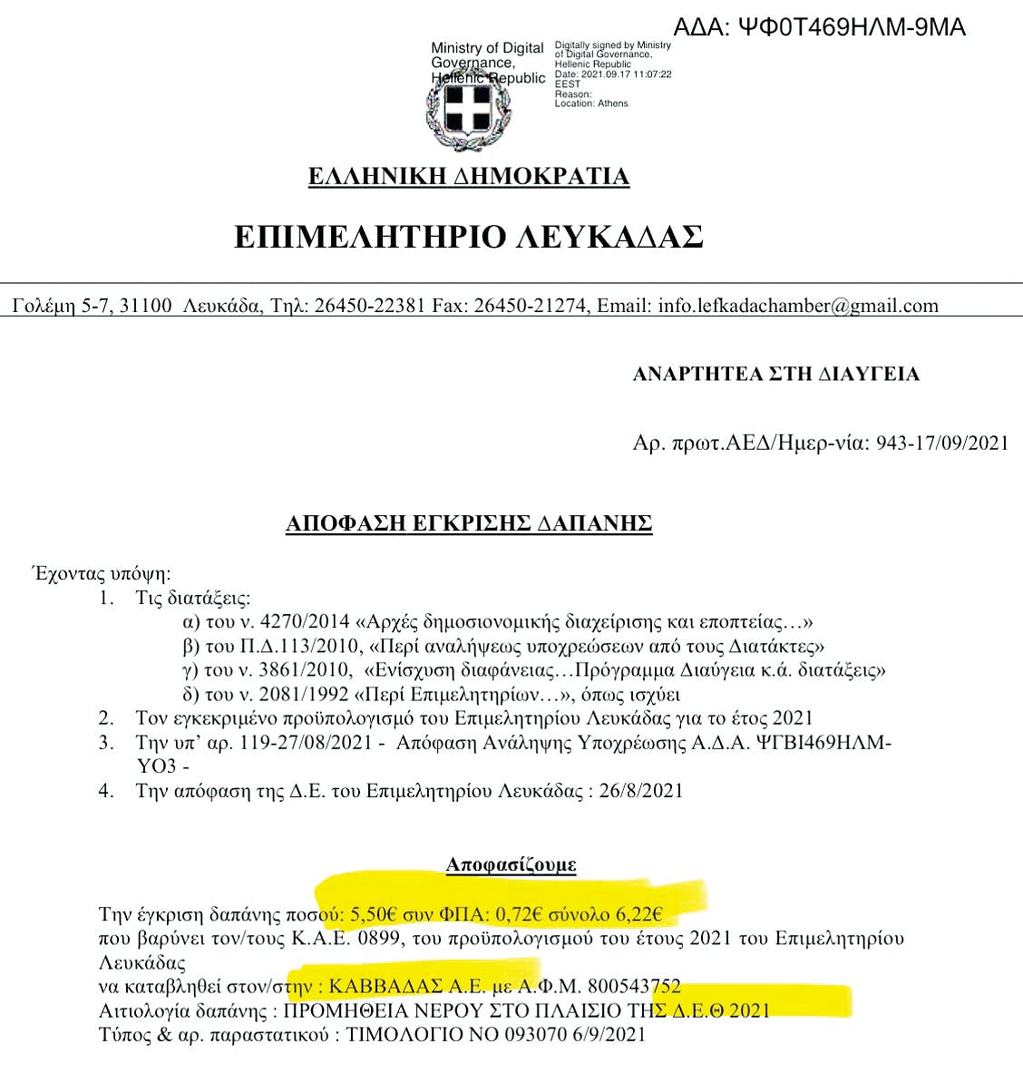 Δόθηκαν οι σχετικές εξηγήσεις, αλλά με αφορμή αυτόν τον ντόρο άρχισαν να ξεφυτρώνουν και διάφορα… μαργαριτάρια. Ενα από τα πιο χαρακτηριστικά είναι η απόφαση του 2021, όταν ήταν ήδη βουλευτής. Το Επιμελητήριο Λευκάδας πήγε στη ΔΕΘ και προμηθεύτηκε νερά αξίας μόλις 6,22 ευρώ από την Κάβα Καββαδά. Παρ’ όλα αυτά, έγινε ολόκληρη γραφειοκρατική διαδικασία με αναθέσεις, εγκρίσεις δαπανών και ό,τι άλλο προβλέπει ο νόμος. Τώρα που βρέθηκε το έγγραφο, τα σχόλια στο διαδίκτυο ωστόσο δίνουν και παίρνουν: άλλοι το θεωρούν υπερβολή, ενώ άλλοι -πιο πικρόχολοι- λένε ότι ο νέος υφυπουργός δεν ήθελε να χάσει ούτε σεντ, ακόμα και όταν επρόκειτο για… μπουκάλια νερό.