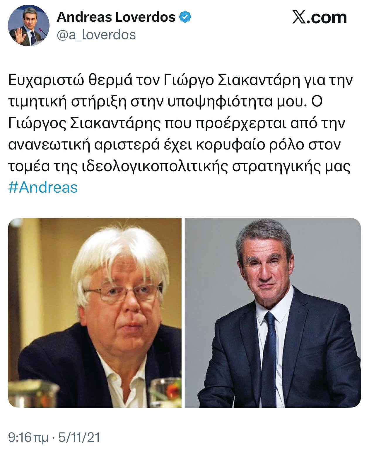 Η σχέση τους, μάλιστα, δεν σταμάτησε εκεί. Οταν το 2023 ο Λοβέρδος δεν βγήκε βουλευτής και αποχώρησε από το ΠΑΣΟΚ, προετοιμάζοντας τα επόμενα βήματά του πριν καταλήξει επισήμως στη Ν.Δ., ο Γ. Σιακαντάρης βγήκε αμέσως με άρθρο «Για τον Ανδρέα Λοβέρδο» και του έπλεξε το εγκώμιο: «Οσον αφορά τον Λοβέρδο, είναι από τους λίγους ευθείς πολιτικούς που ό,τι λέει το πιστεύει. Με συγκροτημένο πολιτικό λόγο, με τον οποίο μπορείς να συμφωνήσεις ή να διαφωνήσεις, χωρίς να χρειάζεται ερμηνεία. Και είναι από τους λίγους πολιτικούς που μπορεί να τον κάνεις και να σε κάνει φίλο, χωρίς να το μετανιώσεις από ανθρώπινης πλευράς».