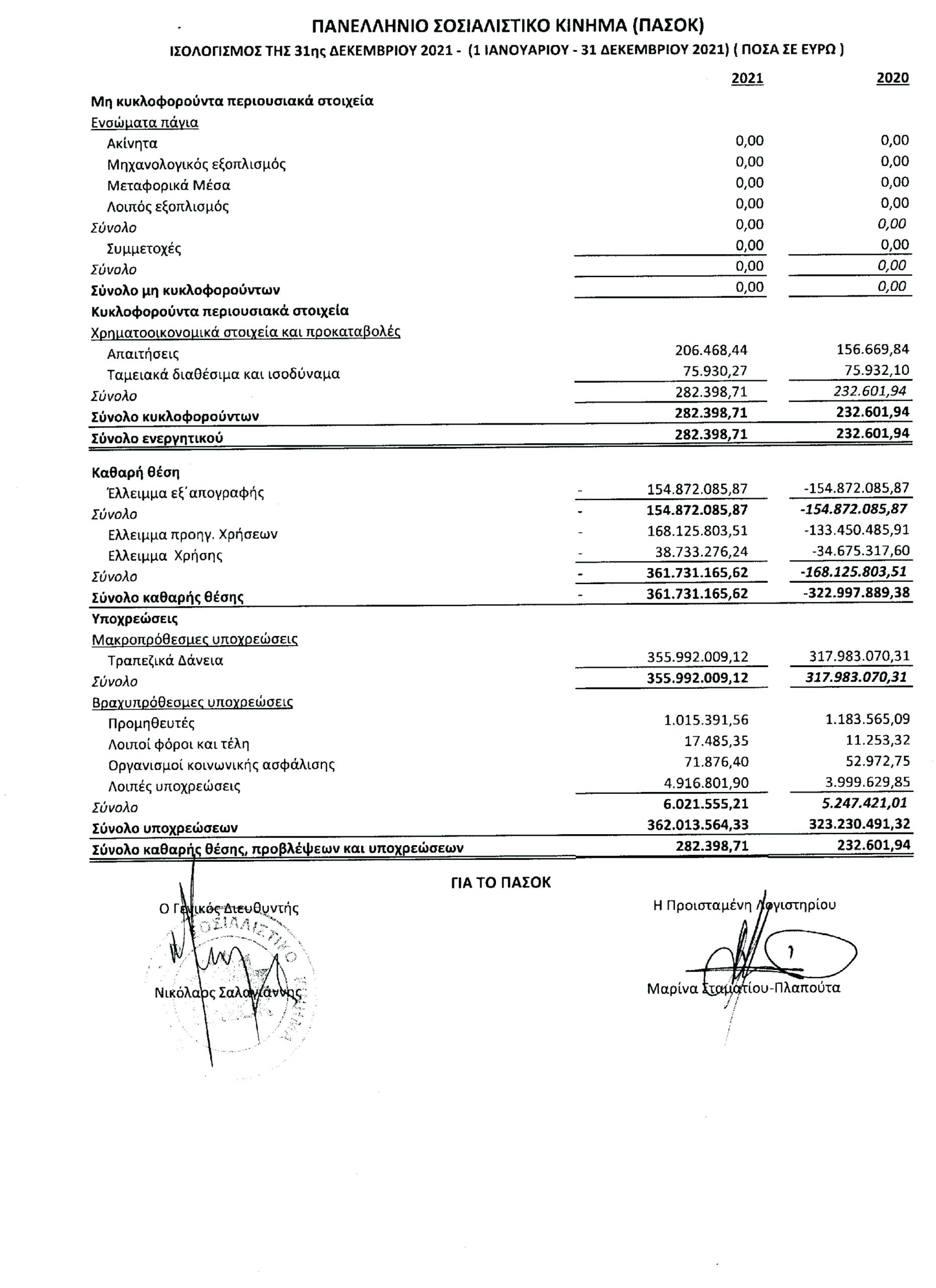 Μπορεί το όνομα «ΠΑΣΟΚ» να επέστρεψε και να ξαναπήρε τη θέση του ΚΙΝ.ΑΛ., τα δυσθεώρητα χρέη του όμως όχι μόνο δεν έφυγαν ποτέ από τη Χαριλάου Τρικούπη αλλά χρόνο με τον χρόνο αυξάνονται με γεωμετρική πρόοδο και έχουν φτάσει τα 362.013.564,33 ευρώ στο σύνολό τους, εκ των οποίων τα 355.992.009,12 είναι οφειλές από τραπεζικά δάνεια. Τα στοιχεία αναφέρονται στον ισολογισμό του 2021, ο οποίος δημοσιεύτηκε στις 20 Μαΐου, και τον οποίο υπογράφει ο γενικός διευθυντής του κόμματος Νίκος Σαλαγιάννης, πρώην υπουργός.