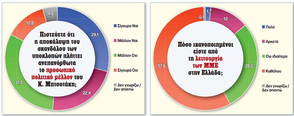 Χαστούκι και στα ΜΜΕ, τα οποία πιάνουν πάτο στην αξιοπιστία. «Πόσο ικανοποιημένοι είστε από τη λειτουργία των ΜΜΕ;» η ερώτηση. «Καθόλου» απαντά το 57,6%, «όχι ιδιαίτερα» το 28,2%, «αρκετά» το 12% και «πολύ ικανοποιημένοι» το 1,7%.
