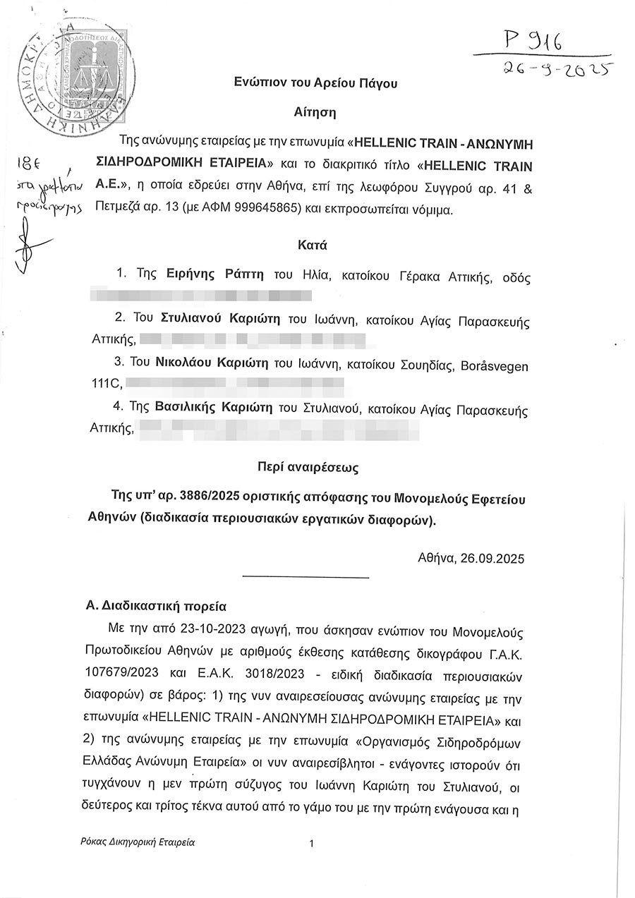 Η «δημοκρατία» αποκαλύπτει ότι η εταιρία άσκησε αναίρεση κατά της απόφασης που δικαίωσε την οικογένεια του αδικοχαμένου μηχανοδηγού Ιωάννη Καριώτη