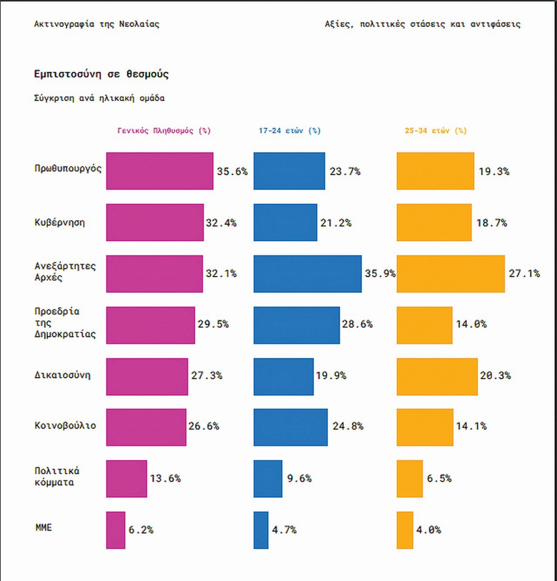 Η εμπιστοσύνη στους θεσμούς αποτελεί ίσως το πιο αποκαλυπτικό πεδίο του χάσματος γενεών. Οι 25-34 ετών εμφανίζουν εξαιρετικά χαμηλά ποσοστά εμπιστοσύνης σχεδόν σε όλους τους θεσμούς. Μόλις 14% εμπιστεύεται την Προεδρία της Δημοκρατίας, το ίδιο ποσοστό το Κοινοβούλιο και λιγότερο από 7% τα πολιτικά κόμματα. Μόνη σχετική εξαίρεση αποτελούν οι Ανεξάρτητες Αρχές με 27,1%, ποσοστό που δείχνει ότι προτιμούν θεσμούς με τεχνοκρατικά ή υπερκομματικά χαρακτηριστικά. Οι 17-24 ετών, παρότι λίγο πιο θετικοί, δεν ξεπερνούν το 25% εμπιστοσύνη στο Κοινοβούλιο, ενώ τα ΜΜΕ καταγράφουν μόλις 4% εμπιστοσύνη, συγκεντρώνοντας τον χαμηλότερο δείκτη εμπιστοσύνης.