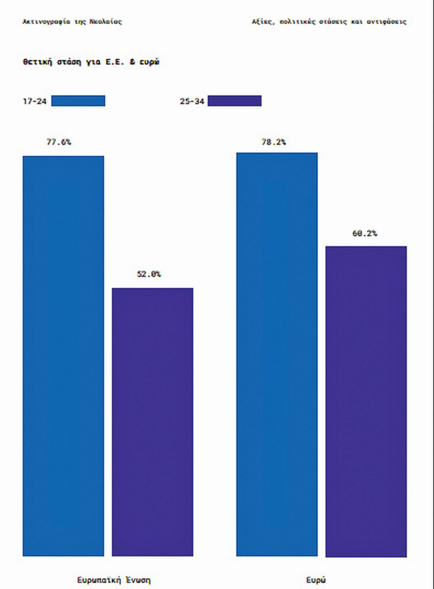 Αντίθετα, η στάση απέναντι στην Ευρωπαϊκή Ενωση και στο ευρώ δείχνει μια πιο φιλοευρωπαϊκή τάση στις νεότερες ηλικίες. Οι 17-24 ετών δηλώνουν σε ποσοστό 77,6% θετική στάση για την Ε.Ε. και 78,2% για το ευρώ -τα υψηλότερα ποσοστά της έρευνας-, ενώ οι 25-34 ετών εμφανίζονται πιο συγκρατημένοι, με 52,8% και 60,2% αντίστοιχα.