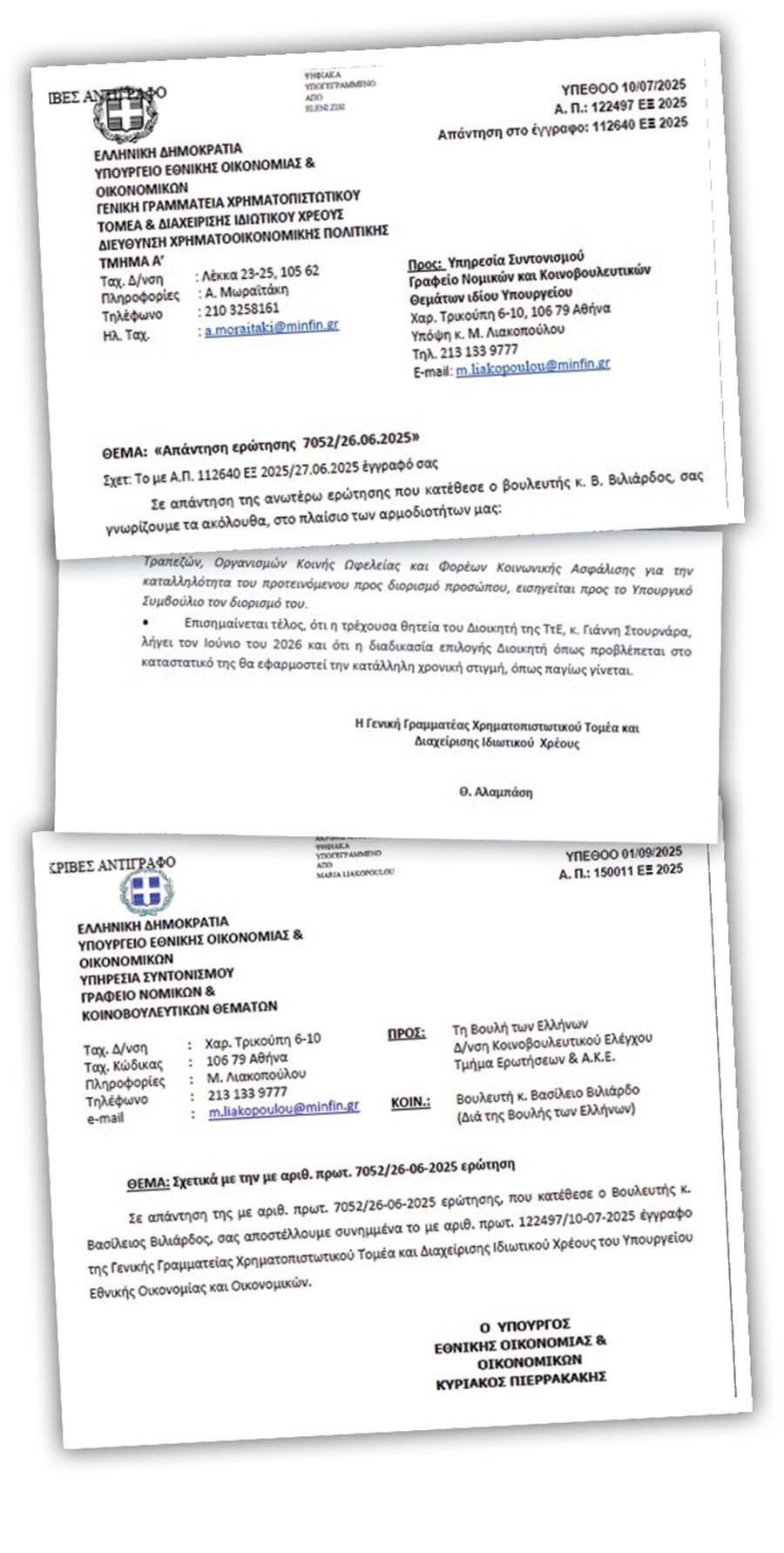 Οι απαντήσεις του Κυρ. Πιερρακάκη και της αρμόδιας υπηρεσίας του ΥΠΟΙΚ