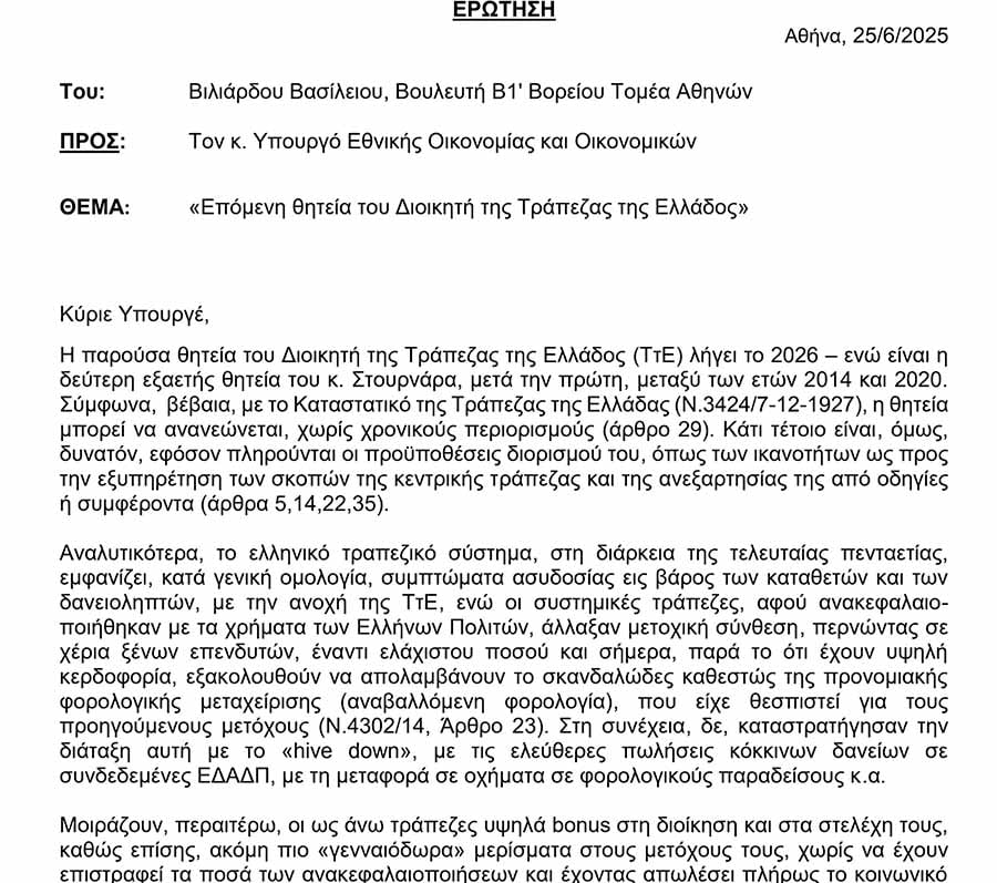 Στις 15 Ιουνίου, η «κυριακάτικη δημοκρατία», με τίτλο «Εκβιάζει το Μαξίμου ο Στουρνάρας», αποκάλυπτε το τελεσίγραφο του κεντρικού τραπεζίτη στον πρωθυπουργό μέχρι τη ΔΕΘ για τη δρομολόγηση ανανέωσης της θητείας του, που λήγει τον προσεχή Μάιο. Στο ρεπορτάζ μας σημειώναμε την ελληνική παραφωνία να βρίσκεται μπροστά σε μια θητεία 18 ετών(!) για τον ίδιο διοικητή, όταν στην ΕΚΤ ο επικεφαλής της δεν μπορεί να ξεπερνά την οκταετία! Δέκα ημέρες μετά το δημοσίευμά μας, στις 25 Ιουνίου, ο βουλευτής Βορείου Τομέα Αθηνών Βασίλης Βιλιάρδος έκανε ερώτηση στη Βουλή, που απευθυνόταν στον υπουργό Οικονομικών Κυριάκο Πιερρακάκη, με θέμα την «επόμενη θητεία του διοικητή της ΤτΕ».