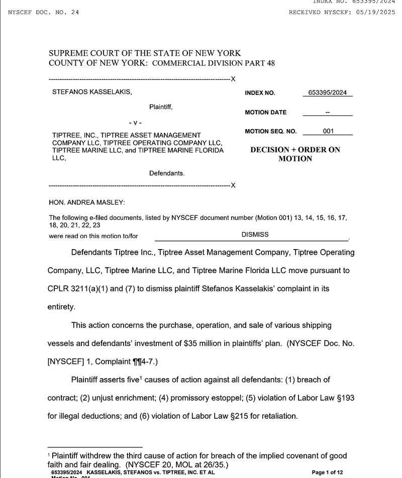 Στις 19 Μαΐου 2025 η δικαστής Αντρέα Μάσλεϊ ενέκρινε εν μέρει την απαίτηση της Tiptree να απορριφθεί η αγωγή του Κασσελάκη.