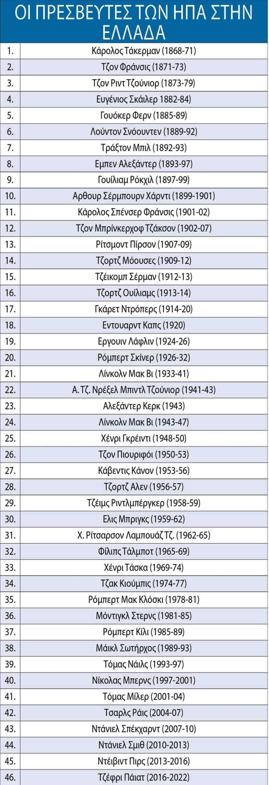 Αλλωστε, και ο προκάτοχός της, Τζορτζ Τσούνης, δεν είχε επίσης καμιά διπλωματική προϋπηρεσία. Η οικογένειά του είχε ξενοδοχεία και ο ίδιος ήταν πρόεδρος ξενοδοχειακού ομίλου. Το 2021 ο Μπάιντεν μάς τον έστειλε ως Αμερικανό πρέσβη. Και ο απολογισμός της ολοκληρωμένης θητείας του δεν είναι θετικός. Τα απειλούμενα ελληνικά νησιά αποψιλώθηκαν από ζωτικής σημασίας οπλικά συστήματα, που στάλθηκαν στην Ουκρανία μέσω των πιο αδιαφανών διαδικασιών στην Ευρώπη. Στρατόπεδα έκλεισαν σε όλη την ελληνική επικράτεια. Στα Ελληνοτουρκικά ο Τσούνης εξίσωνε τον θύτη (Τουρκία) με τον απειλούμενο (Ελλάδα).