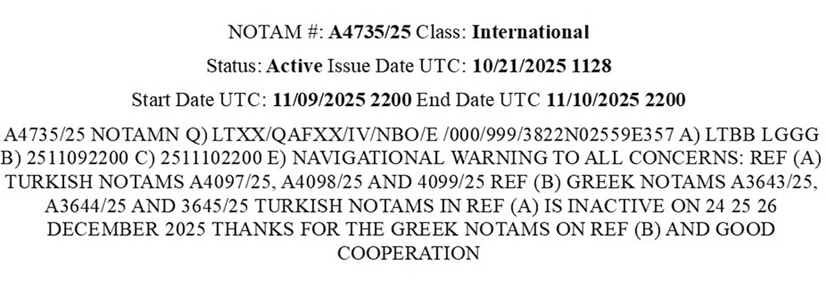Ο δεύτερος λόγος είναι ότι, μολονότι η Τουρκία δηλώνει ότι θα ακυρώσει τις τρεις ασκήσεις ΑSFAO με την αγγελία Α4735 για 24, 25, 26 Δεκεμβρίου, εντούτοις η ματαίωση είναι «μαϊμού», διότι η αγγελία Α4735 λήγει και παύει να ισχύει στις 10 Νοεμβρίου 2025 στις 22:00, αμέσως με το πέρας εορτής μνήμης του Ατατούρκ, με αποτέλεσμα να μην έχει ισχύ στις 24, 25 και 26 Δεκεμβρίου για τη ματαίωση των τουρκικών ασκήσεων.