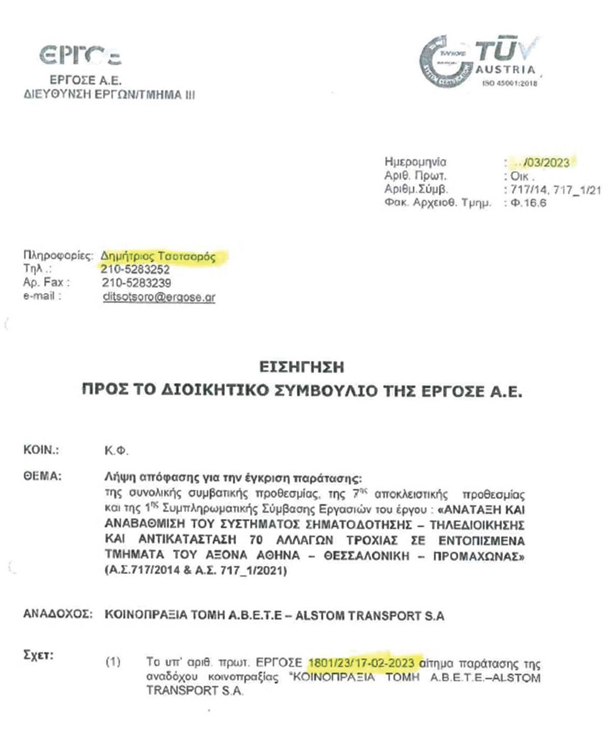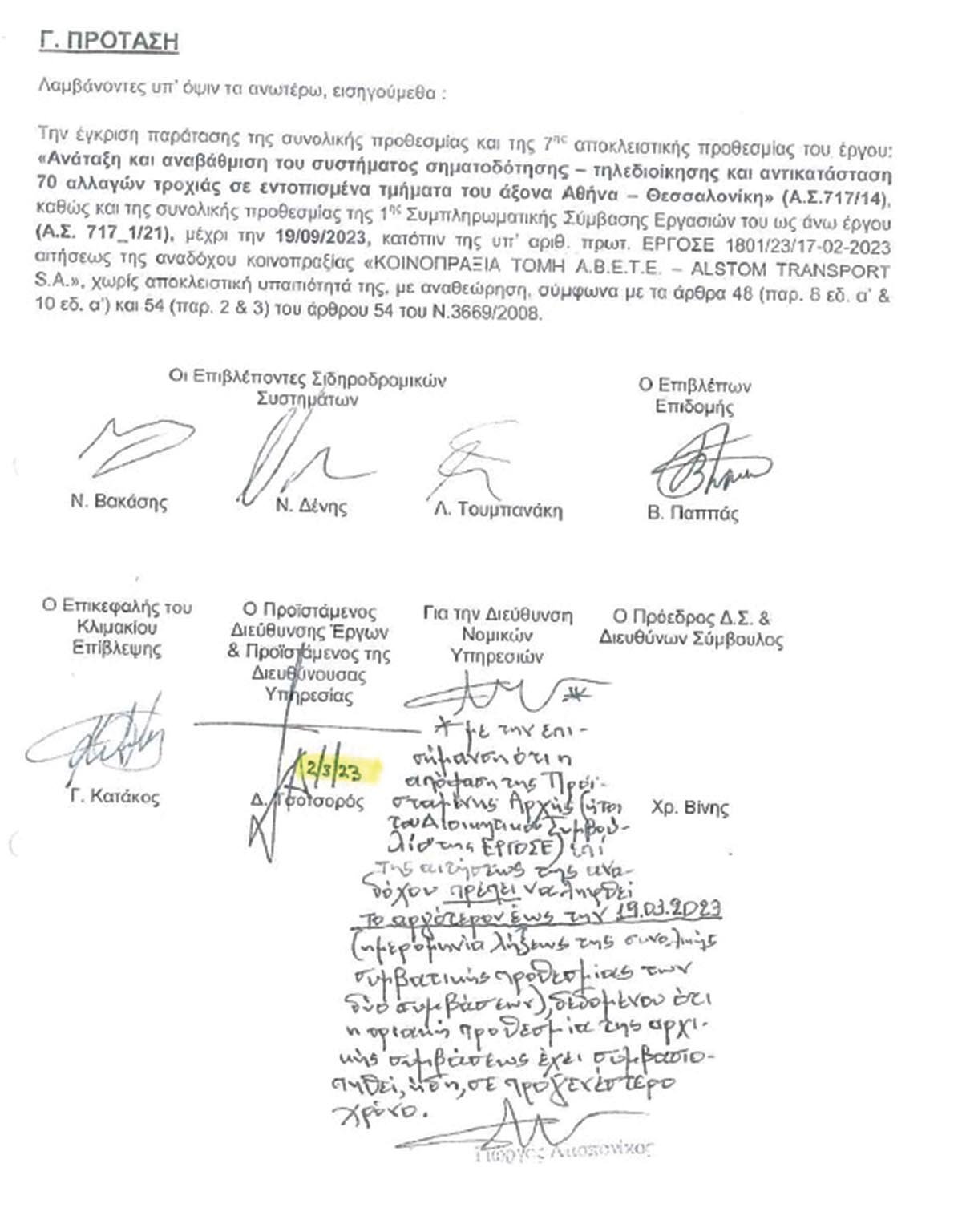 Για να δώσουν… παράταση έως τον Σεπτέμβριο του 2023, απαντώντας στην επιστολή της Κοινοπραξίας! Την ημέρα, δηλαδή, που στον τόπο του εγκλήματος μάζευαν πτώματα, ανθρώπινα μέλη, μπάζωναν τον τόπο και σήκωναν τα διαλυμένα και καμένα από τη μεγάλη φωτιά βαγόνια, αυτά τα μέλη της ΕΡΓΟΣΕ, υπό τον Δημήτρη Τσοτσορό, έπαιρναν απόφαση… παράτασης εκτέλεσης του έργου για τη σύμβαση 717 και δεν ντράπηκαν να στείλουν επίσημο χαρτί της εταιρίας, στην πρώτη σελίδα του οποίου δεν υπάρχει πλήρης ημερομηνία της απόφασης, αλλά …/03/2023.