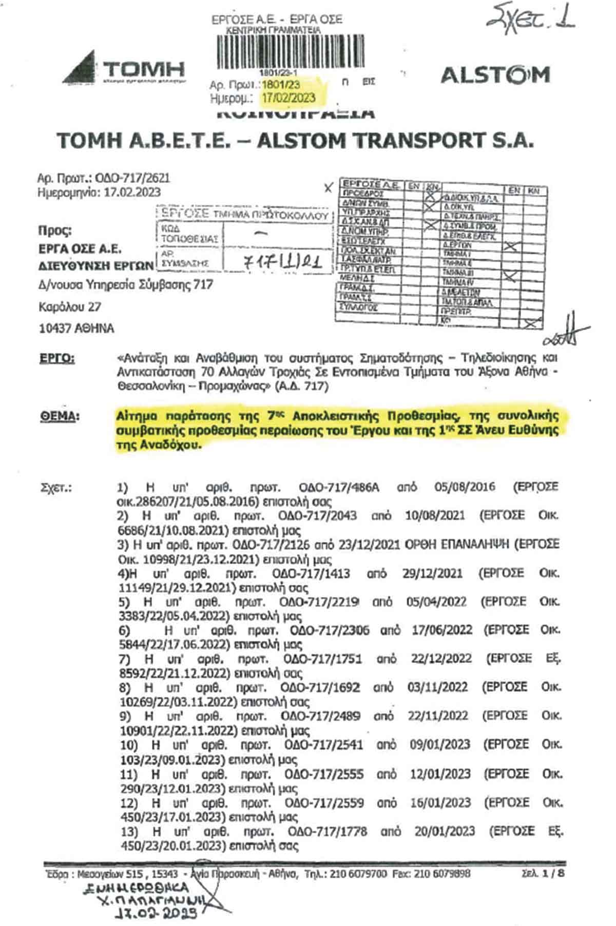 Στα έγγραφα που παρουσιάζουμε σήμερα, η Κοινοπραξία Τομή ΑΒΕΤΕ – Alstom Transport, που έχει την αποκλειστικότητα εκτέλεσης της σύμβασης 717, αποκαλύπτεται ότι έστειλε επιστολή στην ΕΡΓΟΣΕ, στις 17 Φεβρουαρίου 2023, δηλαδή 11 ημέρες πριν από το «έγκλημα» των Τεμπών και καταθέτει αίτημα παράτασης της 7ης αποκλειστικής προθεσμίας (δηλαδή της έβδομης παράτασης) της συνολικής συμβατικής προθεσμίας περαίωσης του έργου, υποσημειώνοντας «άνευ ευθύνης της αναδόχου»!