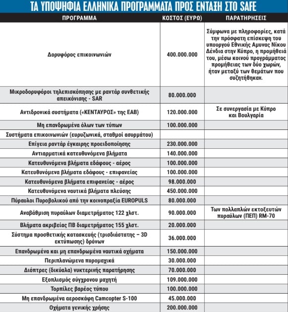 Σε ό,τι αφορά το κόστος των υποψήφιων προς ένταξη προγραμμάτων, φέρεται πλέον ότι έχει εκτοξευθεί στα 2,950 δισ. ευρώ, μετά την προσθήκη κάποιων προγραμμάτων του υπουργείου Ψηφιακής Διακυβέρνησης (ΥΨΗΔ). Ποσό σχεδόν τετραπλάσιο των 787.669.283 ευρώ που η Ευρωπαϊκή Επιτροπή είχε προσδιορίσει για τη χώρα μας στην προσωρινή κατανομή της χρηματοδοτικής χορήγησης της 9ης Σεπτεμβρίου 2025. Υπενθυμίζεται ότι στις 29 Ιουλίου 2025 η χώρα μας είχε αιτηθεί κατ’ ελάχιστο 550 εκατ. ευρώ και μέγιστο 1,15 δισ. ευρώ ως χρηματοδότηση από το SAFE. Οπότε είναι εύκολα διακριτό το δυσανάλογο, σε σχέση με την προσωρινή κατανομή, ύψος των υποψήφιων προς ένταξη προγραμμάτων.
