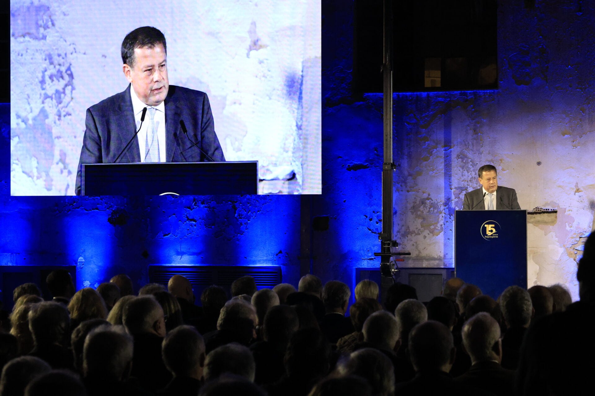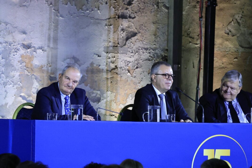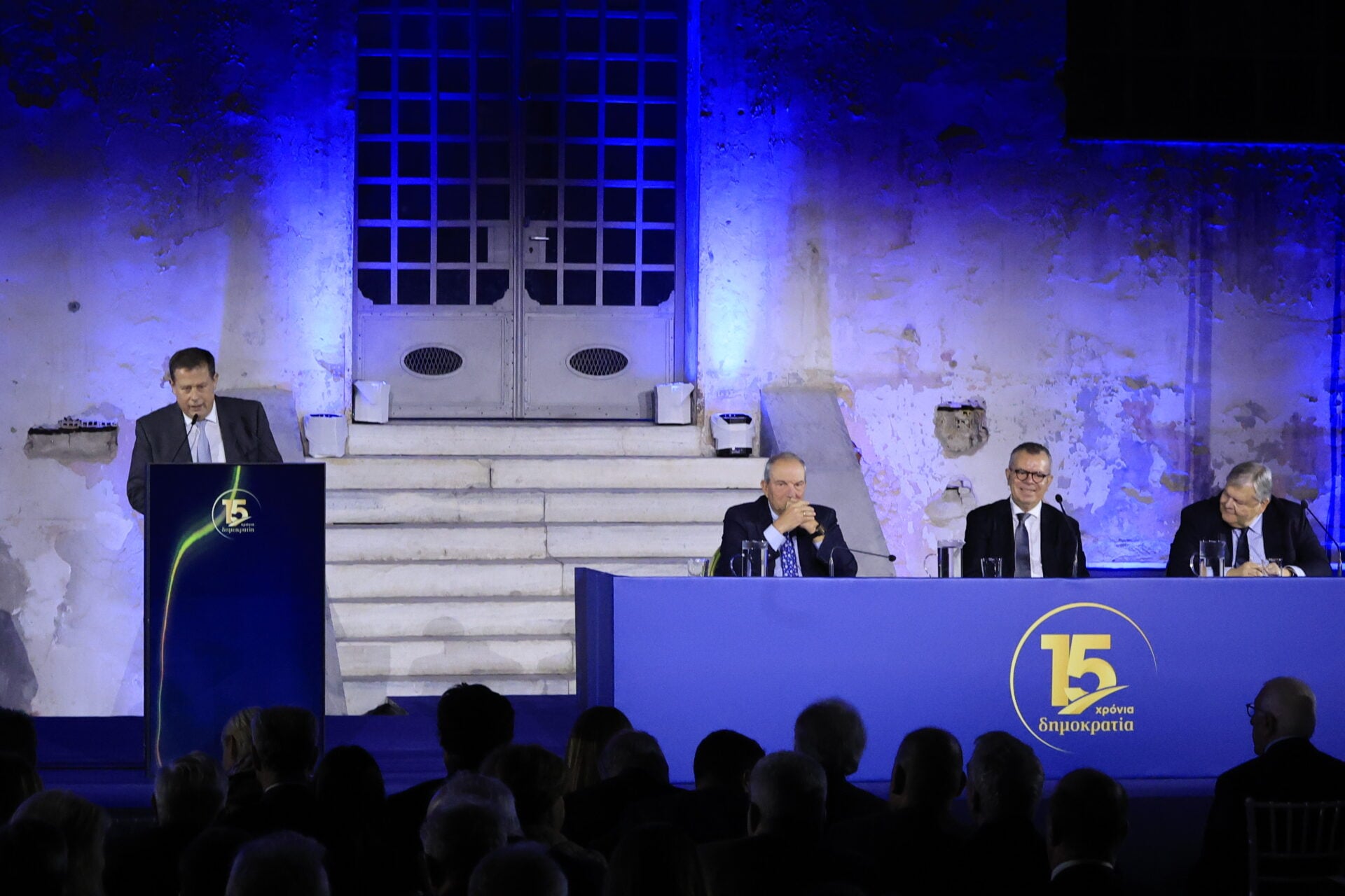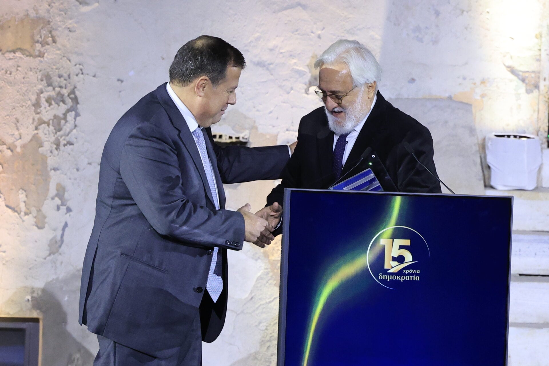 Eπετειακή εκδήλωση από την εφημερίδα “δημοκρατία” με την ευκαιρία της συμπλήρωσης 15 ετών από την πρώτη κυκλοφορία της, στον πολιτιστικό χώρο του πρώην Δημοσίου Καπνεργοστασίου, Δευτέρα 8 Δεκεμβρίου 2025. Κεντρικοί ομιλητές στην εκδήλωση ήταν ο πρώην πρωθυπουργός Κώστας Καραμανλής και ο πρώην πρόεδρος του ΠΑΣΟΚ Ευάγγελος Βενιζέλος. Συντονιστής της συζήτησης με θέμα την “Κρίση της Δημοκρατίας σήμερα”, ο αρθρογράφος της “δημοκρατίας” και διευθυντής της εφημερίδας “Εστία”, Μανώλης Κοττάκης. Επίσης τιμήθηκε για το έργο του και τη διαχρονική προσφορά του στον ελληνικό πολιτισμό, ο σκηνοθέτης Γιάννης Σμαραγδής. (ΓΙΩΡΓΟΣ ΚΟΝΤΑΡΙΝΗΣ/EUROKINISSI)Eπετειακή εκδήλωση από την εφημερίδα “δημοκρατία” με την ευκαιρία της συμπλήρωσης 15 ετών από την πρώτη κυκλοφορία της, στον πολιτιστικό χώρο του πρώην Δημοσίου Καπνεργοστασίου, Δευτέρα 8 Δεκεμβρίου 2025. Κεντρικοί ομιλητές στην εκδήλωση ήταν ο πρώην πρωθυπουργός Κώστας Καραμανλής και ο πρώην πρόεδρος του ΠΑΣΟΚ Ευάγγελος Βενιζέλος. Συντονιστής της συζήτησης με θέμα την “Κρίση της Δημοκρατίας σήμερα”, ο αρθρογράφος της “δημοκρατίας” και διευθυντής της εφημερίδας “Εστία”, Μανώλης Κοττάκης. Επίσης τιμήθηκε για το έργο του και τη διαχρονική προσφορά του στον ελληνικό πολιτισμό, ο σκηνοθέτης Γιάννης Σμαραγδής. (ΓΙΩΡΓΟΣ ΚΟΝΤΑΡΙΝΗΣ/EUROKINISSI)(ΓΙΩΡΓΟΣ ΚΟΝΤΑΡΙΝΗΣ/EUROKINISSI)