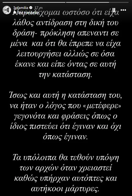 «Παραδέχομαι ωστόσο ότι είχα λάθος αντίδραση στη δική του δράση – προκληση απέναντι σε μένα και ότι θα έπρεπε να είχα λειτουργήσει αλλιώς σε όσα έκανε και είπε όντας σε αυτή την κατάσταση», γράφει ο πρώην μπασκετμπολίστας.
