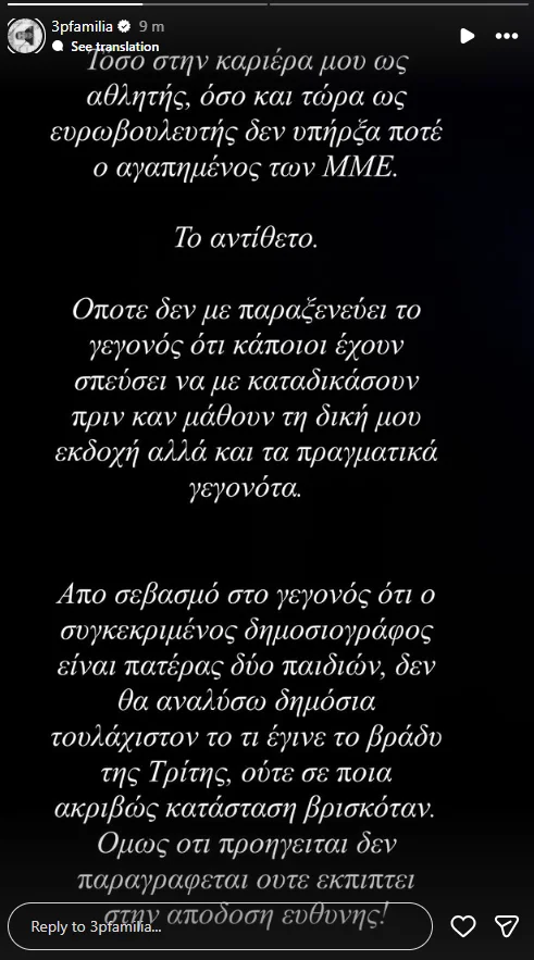 Οπότε δεν με παραξενεύει το γεγονός ότι κάποιοι έχουν σπεύσει να με καταδικάσουν πριν καν μάθουν τη δική μου εκδοχή και τα πραγματικά γεγονότα», γράφει ο Παππάς.