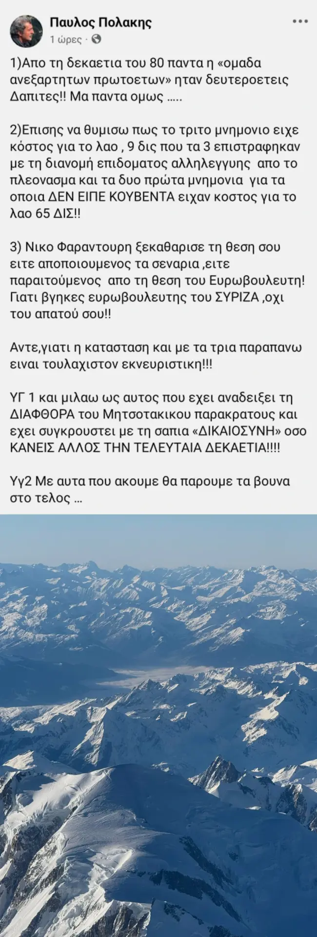 Παράλληλα, ο Παύλος Πολάκης ζητά από τον ευρωβουλευτή του ΣΥΡΙΖΑ Νικόλα Φαραντούρη να ξεκαθαρίσει τη θέση του αναφορικά με τις φήμες που τον συνδέουν με το υπό διαμόρφωση κόμμα της Μαρίας Καρυστιανού, καλώντας τον να πάρει θέση, είτε απορρίπτοντας τα σενάρια είτε παραιτούμενος από τη θέση του ευρωβουλευτή.