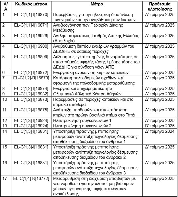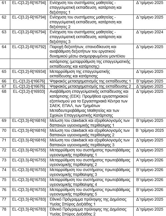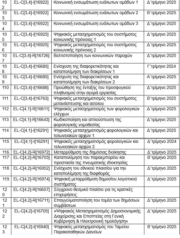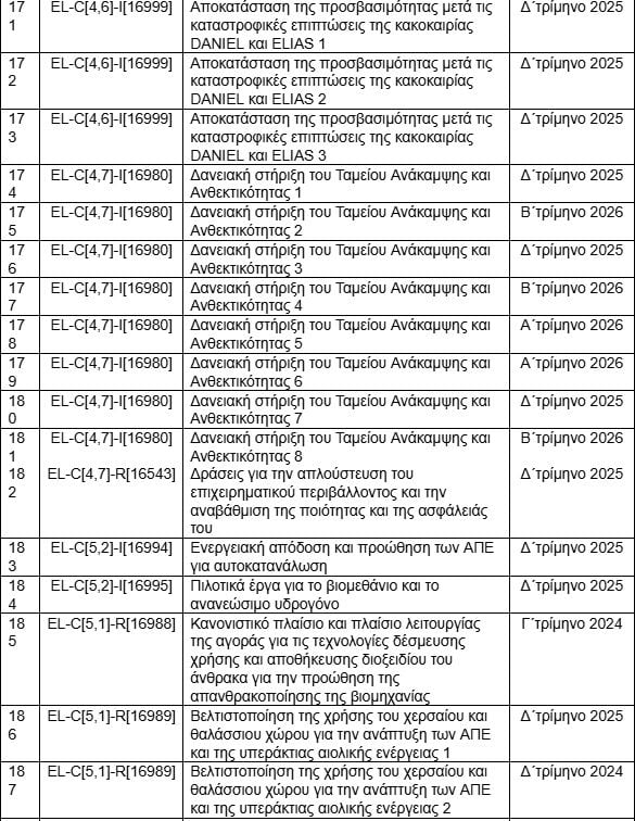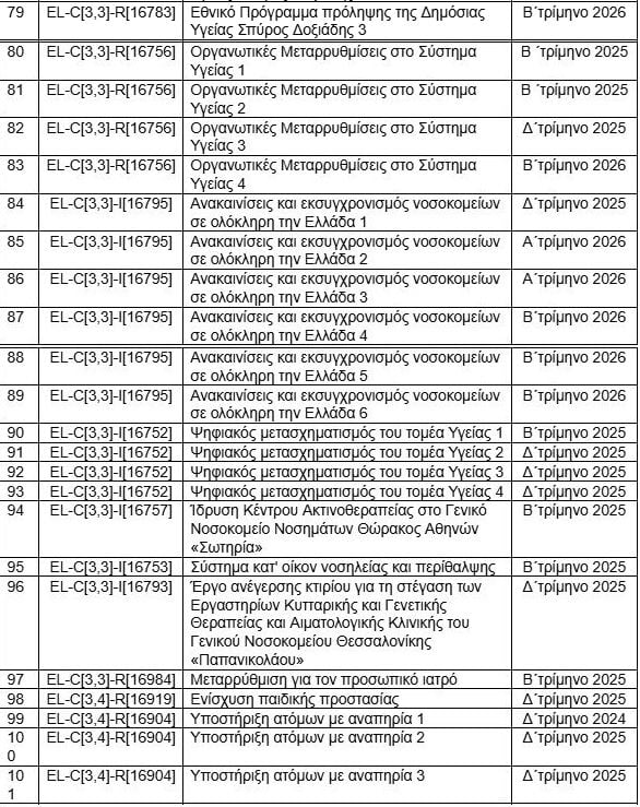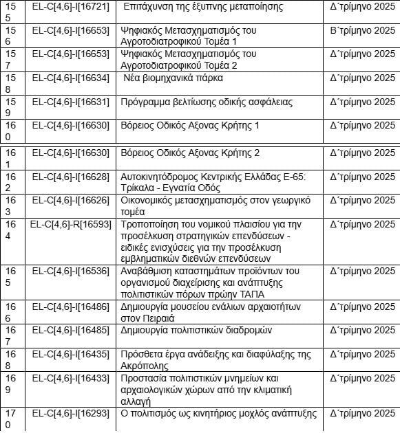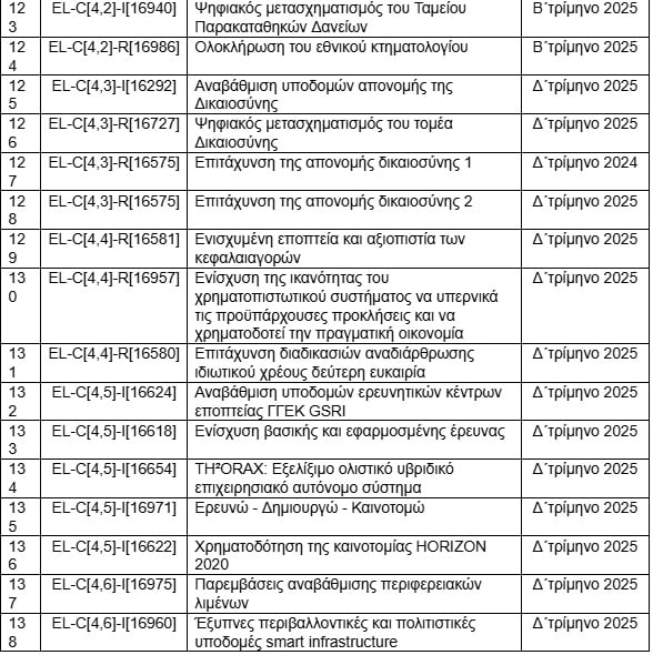 Ο πίνακας είναι δημοσιευμένος (μόνο στα αγγλικά) στην ιστοσελίδα της Κομισιόν και παραθέτει τα 204 ορόσημα που πρέπει να υλοποιηθούν μέχρι το τέλος του προγράμματος. Η συντριπτική πλειοψηφία τους θα έπρεπε να έχει ολοκληρωθεί το 2024 και 2025. Με τις συνεχείς αναθεωρήσεις, η κυβέρνηση εξασφάλισε παράταση μέχρι το τέλος του προγράμματος, το καλοκαίρι του 2026.
