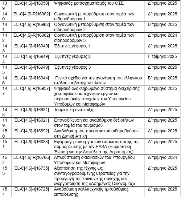 Στο «αέρα» φαίνεται πως βρίσκονται προς το παρόν και τα ορόσημα του μέτρου για την οργανωτική μεταρρύθμιση του σιδηροδρομικού τομέα (μέτρο 16982). Αυτό αφορά τη νέα ενοποιημένη εταιρία σιδηροδρομικών υποδομών (Σιδηρόδρομοι Ελλάδας). Αλλά ενώ μέχρι τον περασμένο Ιούλιο προβλεπόταν ότι η νέα συγχωνευμένη εταιρία σιδηροδρομικών υποδομών θα τεθεί σε πλήρη λειτουργία μέχρι τα τέλη του 2025, στην τελευταία πρόταση αναθεώρησης δεν υπάρχει αυτή η αναφορά.