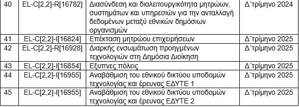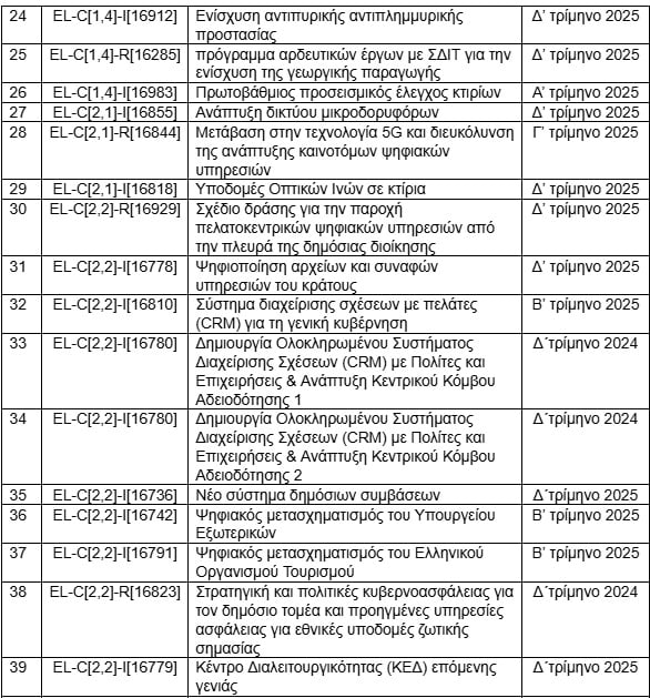 – Δημήτρης Παπαστεργίου, υπουργός Ψηφιακής Διακυβέρνησης: «Κίτρινη« κάρτα έχουν βγει και για τον υπουργό Ψηφιακής Διακυβέρνησης, καθώς έχει… ρεκόρ έργων που απλά θα παραδώσει αντί να ολοκληρώσει, με αυτό να σημαίνει, δηλαδή, ότι όλα δεν θα είναι πλήρως λειτουργικά. Για παράδειγμα, το μέτρο 16824 για την ψηφιακή διακυβέρνηση (αφορά τη διαλειτουργικότητα μεταξύ των μητρώων των κεντρικών φορέων δημόσιας διοίκησης), για το οποίο προβλεπόταν η ολοκλήρωση των έργων με έκθεση τεκμηρίωσης ολοκλήρωσης από το υπουργείο Ψηφιακής Διακυβέρνησης μέχρι τα τέλη του 2025. Με τη νέα πρόταση αναθεώρησης ο επιδιωκόμενος στόχος κατεβαίνει σε απλή «παράδοση» των πλατφορμών ηλεκτρονικών μητρώων.