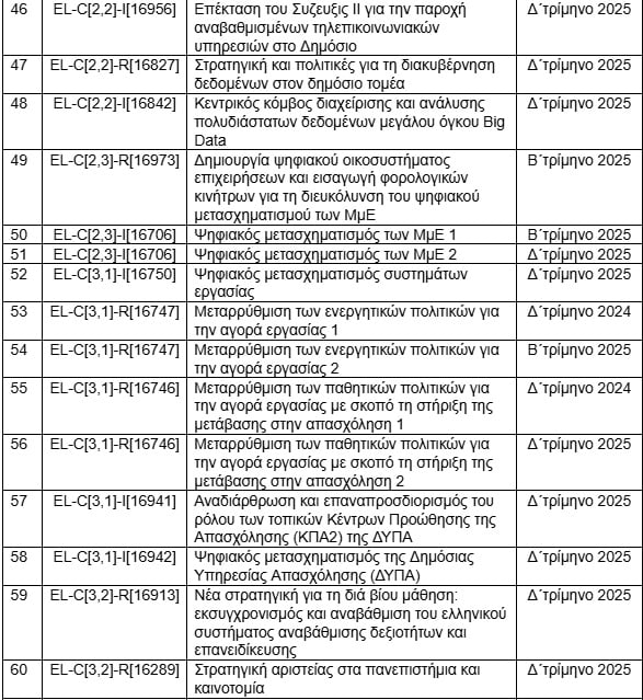 – Θοδωρής Λιβάνιος, υπουργός Εσωτερικών: Την τελευταία στιγμή θα κριθεί και ακόμα ένα ορόσημο του υπουργείου Εσωτερικών. Μεταξύ άλλων, προβλέπει δράσεις για την καταπολέμηση της διαφθοράς στο Δημόσιο. Στο συγκεκριμένο μέτρο (16952), ενώ μέχρι και την αναθεώρηση του περασμένου Ιουλίου προβλεπόταν μέχρι το τέλος του 2025 να έχουμε «ολοκλήρωση έργων που αφορούν τις ψηφιακές ικανότητες και τις ικανότητες υποδομών της Εθνικής Αρχής Διαφάνειας», στη νέα πρόταση αναθεώρησης έχουμε απλά «Εκτέλεση επενδυτικών έργων για την υποστήριξη των ψηφιακών και κτιριακών υποδομών της Εθνικής Αρχής Διαφάνειας».