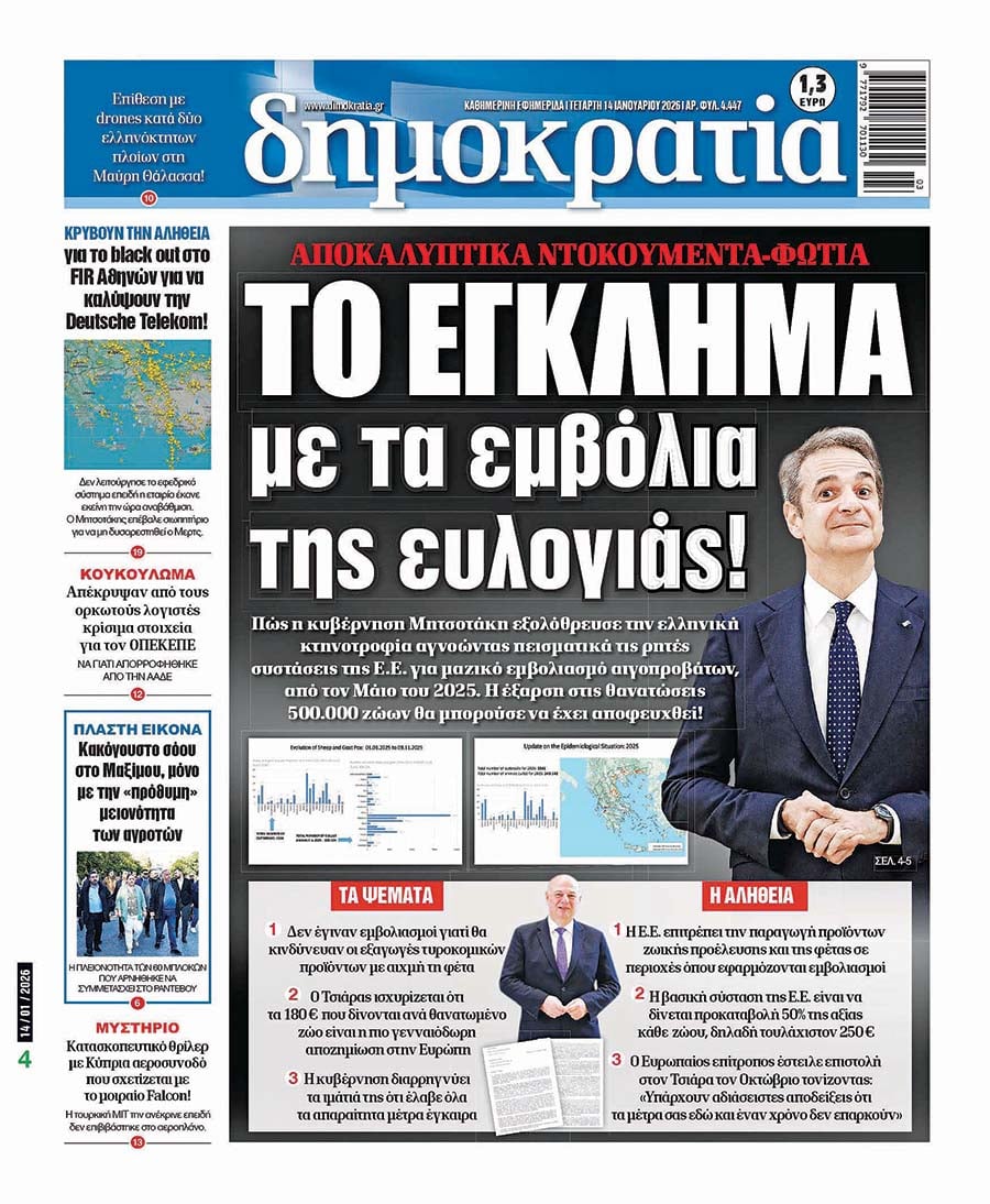 Για τα εμβόλια που όλος ο κτηνοτροφικός κόσμος βράζει λόγω της κυβερνητικής αδιαλλαξίας, για όσα η Ευρώπη διαρκώς προειδοποιεί και κατηγορεί τις αποφάσεις υπουργείου και Μαξίμου, ο πρωθυπουργός και τα επιτελεία του επιχειρούν να κάνουν το μαύρο άσπρο. Οπως σε όλα τα σκάνδαλα και σημαντικά ζητήματα. Μόνο εξωγήινους δεν έχουν ανακαλύψει, όπως παραλίγο να μας πούνε για το μπλακάουτ στο FIR. Ακριβώς επειδή το ρεπορτάζ της περασμένης εβδομάδας από τη «δημοκρατία» ήταν πλήρως στοιχειοθετημένο και βασισμένο αποκλειστικά σε επίσημα έγγραφα του Ευρωπαίου επιτρόπου και της Ε.Ε., ο κυβερνητικός μηχανισμός έσπευσε να προβάλει το δικό του αφήγημα. Με μισές αλήθειες, ολόκληρα ψέματα και παραμύθια που κανένας κτηνοτρόφος δεν αναγνωρίζει.