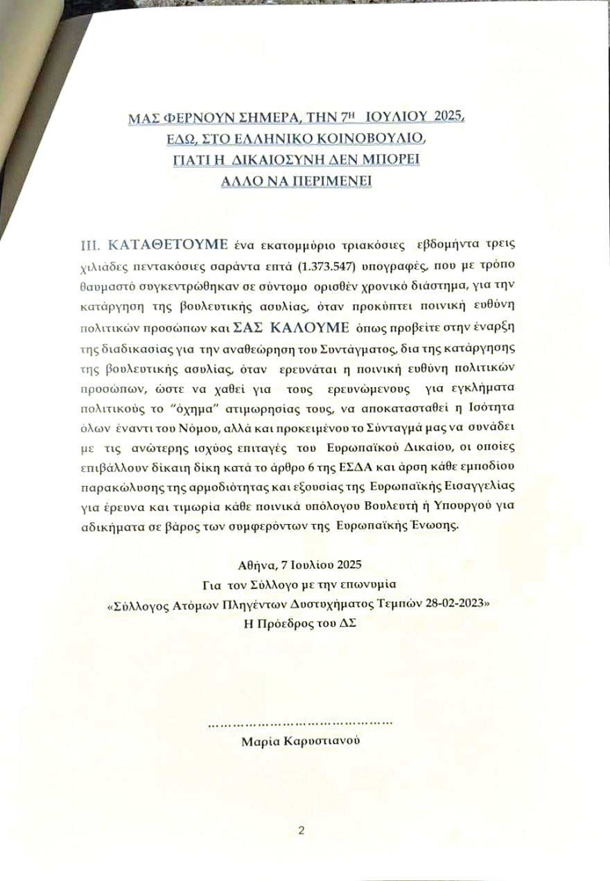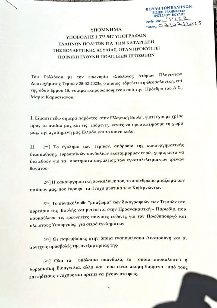 Προφάσεις εν αμαρτίαις προβάλλονται (και) από τη Βουλή, προκειμένου να «ξεπλυθεί» η κυβέρνηση και το υπόλοιπο πολιτικό σύστημα, για το θάψιμο των 1.373.547 υπογραφών που έχουν συγκεντρωθεί από την άνοιξη του 2024 για το έγκλημα των Τεμπών και τη συγκάλυψή του.
