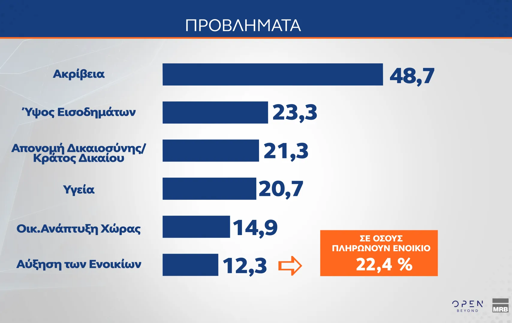 Ωστόσο για μια ακόμη φορά η ακρίβεια παραμένει το μεγαλύτερο πρόβλημα των πολιτών, με ποσοστό 48,7%. Στη δεύτερη θέση ακολουθεί το ύψος εισοδημάτων με 23,3% και τρίτη η απονομή δικαιοσύνης/κράτος δικαίου, με 21,3%.