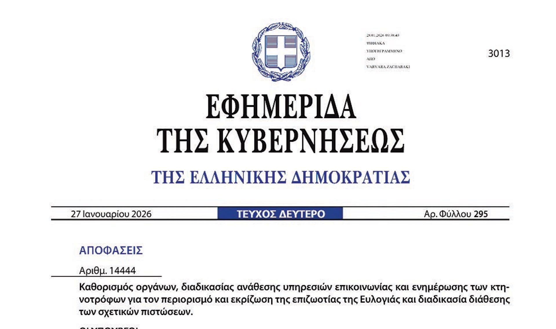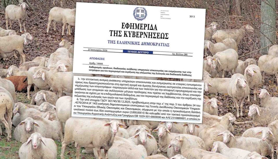 Λες και υπάρχει έστω ένας κτηνοτρόφος στην Ελλάδα που περιμένει να μάθει τι πρέπει να κάνει από σποτάκια στους τηλεοπτικούς σταθμούς. Οπως δημοσιεύτηκε στην Εφημερίδα της Κυβερνήσεως στις 27 Ιανουαρίου 2026 έχει ληφθεί η απόφαση για «καθορισμό οργάνων, διαδικασία ανάθεσης υπηρεσιών επικοινωνίας και ενημέρωσης των κτηνοτρόφων για τον περιορισμό και εκρίζωση της επιζωοτίας της ευλογιάς και διαδικασία διάθεσης των σχετικών πιστώσεων».