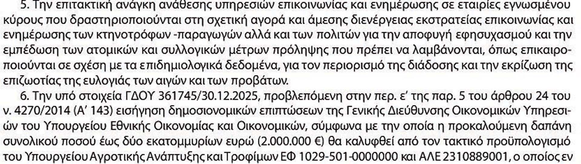 Επίσης, σημειώνεται «η επιτακτική ανάγκη ανάθεσης υπηρεσιών επικοινωνίας και ενημέρωσης σε εταιρίες εγνωσμένου κύρους που δραστηριοποιούνται στη σχετική αγορά και άμεσης διενέργειας εκστρατείας επικοινωνίας και ενημέρωσης των κτηνοτρόφων – παραγωγών αλλά και των πολιτών για την αποφυγή εφησυχασμού και την εμπέδωση των ατομικών και συλλογικών μέτρων πρόληψης».