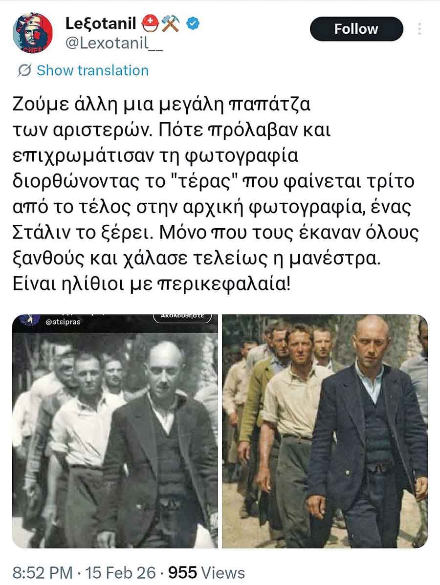 H Lexotanil έγραψε πως «ζούμε άλλη μια παπάτζα των αριστερών. Πότε πρόλαβαν κι επιχρωμάτισαν τη φωτογραφία, διορθώνοντας το “τέρας” που φαίνεται τρίτο από το τέλος στην αρχική φωτογραφία, ένας Στάλιν το ξέρει. Μόνο που τους έκαναν όλους ξανθούς και χάλασε τελείως η μανέστρα. Είναι ηλίθιοι με περικεφαλαία».