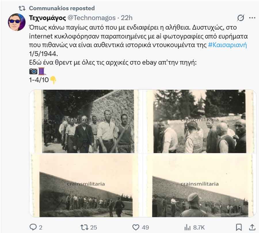 Λογαριασμοί «γνωστών – αγνώστων» σε facebook ή X άρχισαν να ειρωνεύονται, να βγάζουν πλαστές τις φωτογραφίες και να χυδαιολογούν σαν τελειωμένοι νεοναζί ή, τέλος πάντων, με αρρωστημένα μυαλά. Δεν είναι τυχαίο ότι μέσα από το κλίμα μισαλλοδοξίας «εμπνεύστηκαν» κι άλλα ακραία στοιχεία που προκάλεσαν ζημιές με βανδαλισμούς στο μνημείο των 200 εκτελεσμένων στην Καισαριανή, λίγες ώρες μετά τη δημοσιοποίηση των ιστορικών φωτογραφιών.