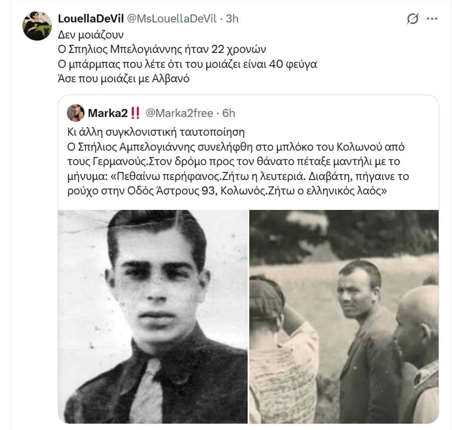 Η LuellaDevil, που, όπως και όλοι οι άλλοι, χυδαιολογεί για τα Τέμπη επί τρία χρόνια, έγραψε χθες για τους 200 της Καισαριανής σχολιάζοντας άλλη ανάρτηση: «Ο Σπήλιος Μπελογιάννης ήταν 22 χρονών. Ο μπάρμπας που λέτε ότι του μοιάζει είναι 40 φεύγα. Ασε που μοιάζει με Αλβανό».