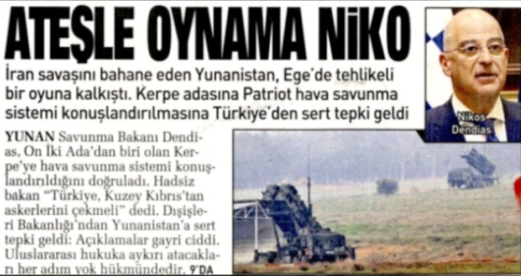 Έντονη νευρικότητα επικρατεί στην Άγκυρα μετά την απόφαση της Αθήνας να μεταφέρει συστοιχία του αντιαεροπορικού συστήματος Patriot στην Κάρπαθο. Η τουρκική εφημερίδα Sabah κυκλοφορεί σήμερα με έναν άκρως προκλητικό τίτλο, στοχοποιώντας προσωπικά τον Έλληνα Υπουργό Εθνικής Άμυνας: «Μην παίζεις με τη φωτιά, Νίκο».