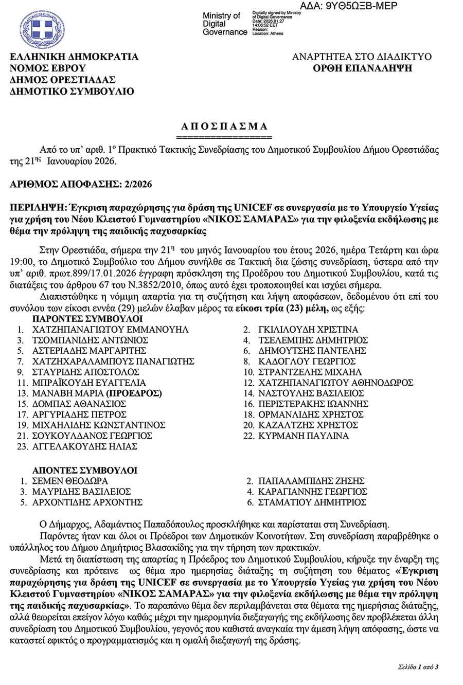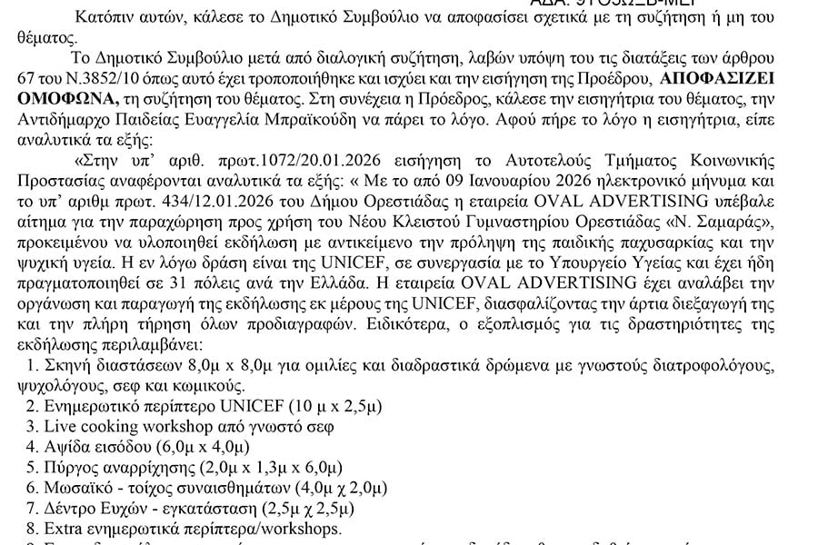 Παραθέτουμε χαρακτηριστικά ανάρτηση του Δήμου Ορεστιάδας, στις 21 Ιανουαρίου 2026: «Εγκριση παραχώρησης για δράση της UNICEF σε συνεργασία με το υπουργείο Υγείας για χρήση του Νέου Κλειστού Γυμναστηρίου “ΝΙΚΟΣ ΣΑΜΑΡΑΣ” για τη φιλοξενία εκδήλωσης με θέμα την πρόληψη της παιδικής παχυσαρκίας». Στην έγκριση αναφέρεται ακόμη ότι «η εταιρεία OVAL ADVERTΙSING έχει αναλάβει την οργάνωση και παραγωγή της εκδήλωσης εκ μέρους της UNICEF.