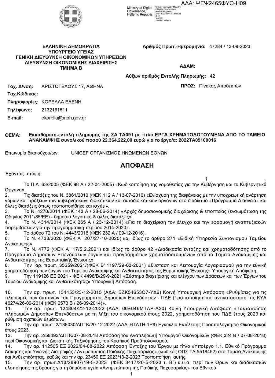 Στο προηγούμενο μέρος της έρευνάς μας αναζητήσαμε ανεπιτυχώς απαντήσεις και από τη UNICEF για τα 69.003.631,25 ευρώ που πήρε από το υπουργείο Υγείας με την υπογραφή της αναπληρώτριας υπουργού Υγείας Ειρήνης Αγαπηδάκη, για δύο προγράμματα, τα οποία χρηματοδοτήθηκαν σε ύψος περίπου 80% από το Ταμείο Ανάκαμψης και Ανθεκτικότητας (ΤΑΑ).