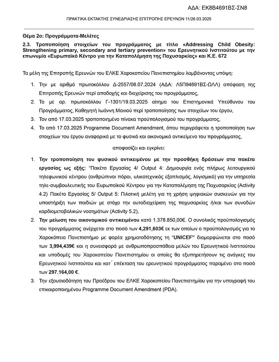 2η απάντηση της UNICEF: «Ενα θεσμικό κληροδότημα του προγράμματος είναι η ίδρυση του Ευρωπαϊκού Κέντρου Πρόληψης της Παχυσαρκίας στο Χαροκόπειο Πανεπιστήμιο. Το υπουργείο Υγείας λαμβάνει τα απαραίτητα μέτρα για να εξασφαλίσει επαρκή χρηματοδότηση και βιωσιμότητα του Κέντρου, πέραν της περιόδου του προγράμματος».