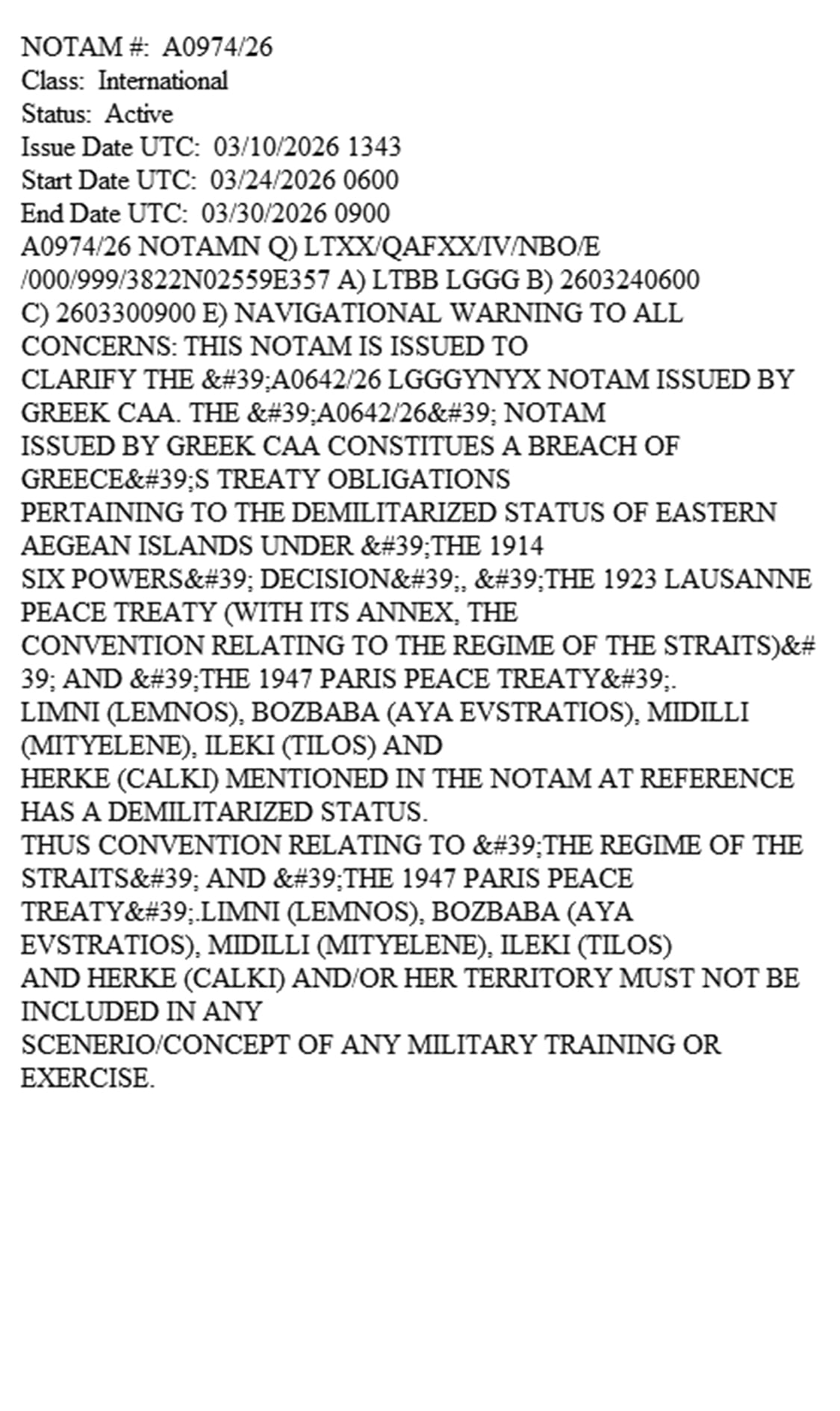 Η Αγκυρα με την υποστήριξη του ΝΑΤΟ εξέδωσε την αγγελία Α 0974/26 με την οποία δηλώνει διεθνώς ότι η Ελλάδα παραβίασε τις Συνθήκες της Λωζάννης και των Παρισίων
